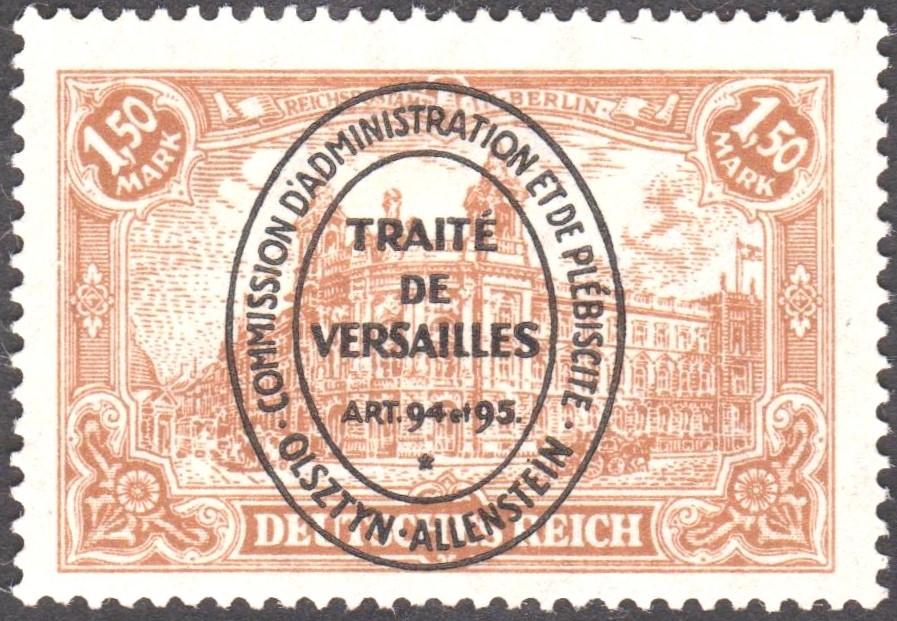 Deutsches Reich MiNr. 114 wurde mit einem schwarzen Buchdruck-Aufdruck im Hochoval versehen und ist katalogisiert als Deutsche Abstimmungsgebiete - Allenstein MiNr. 26: