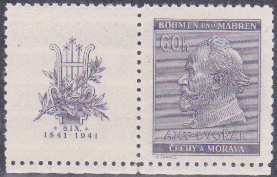 Zum 100. Geburtstag von Antonín Dvořák sind zwei bildgleiche Marken erschienen, die zusammen mit einem Zierfeld schachbrettartig zusammen gedruckt wurden.