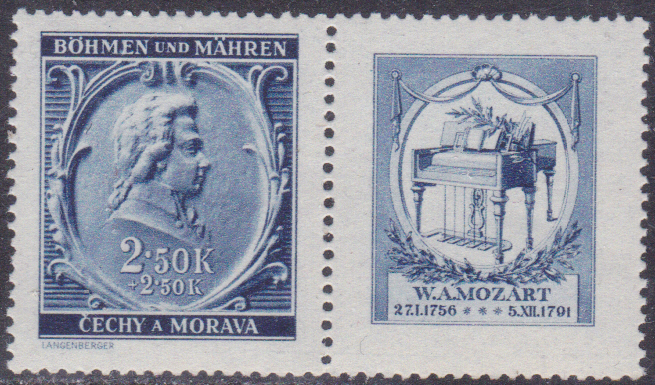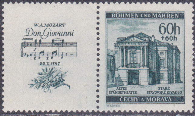 Zum 150. Todestag von Wolfgang Amadeus Mozart wurden zwei bildgleiche Marken mit dem Ständetheater (tschechisch Stavovské divadlo) in Prag verausgabt. Die Marken wurden jeweils mit Zierfeld schachbrettartig zusammenhängend im Bogen zu 50 Marken und 50 Zierfeldern gedruckt.