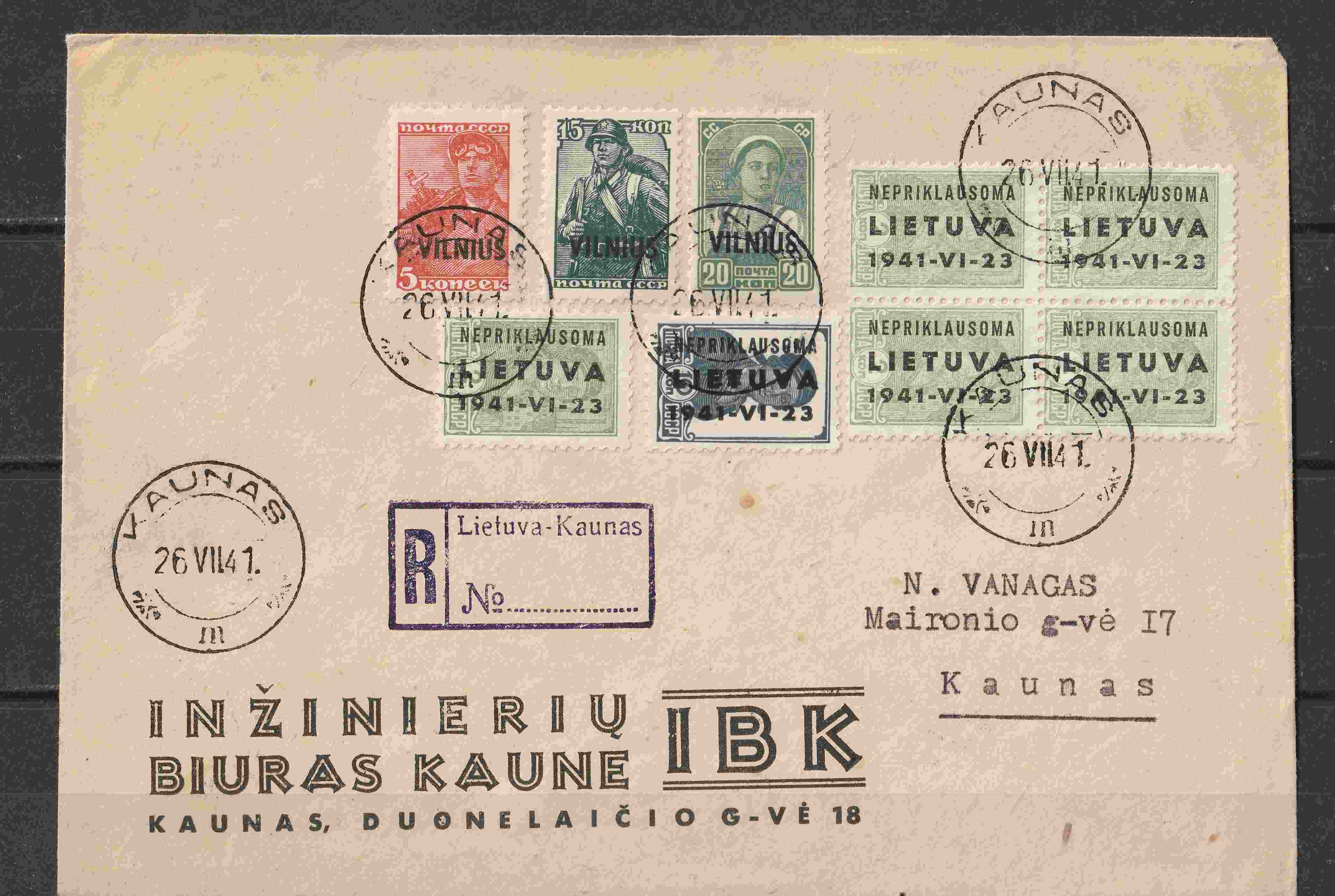 Dieser überfrankierte R-Brief wurde, wie die meisten Satzbriefe aus Vilnius, nicht befördert.
