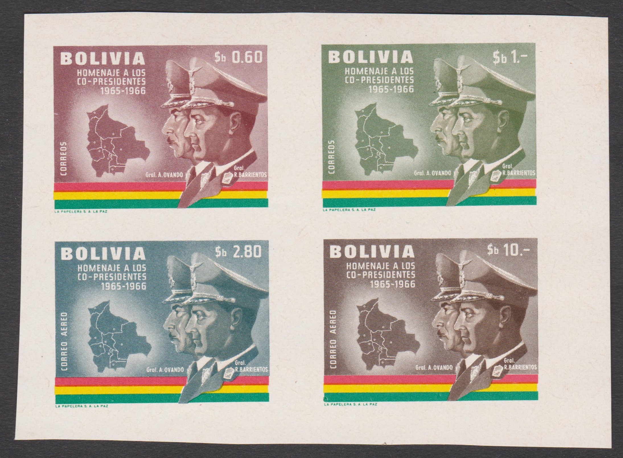 In Bolivien erschien am 15.12.1966 in einer Auflage von lediglich 5000 Exemplaren Block 16, der Bolivien MiNr. 715 - 718 geschnitten als Zusammendruck enthält.