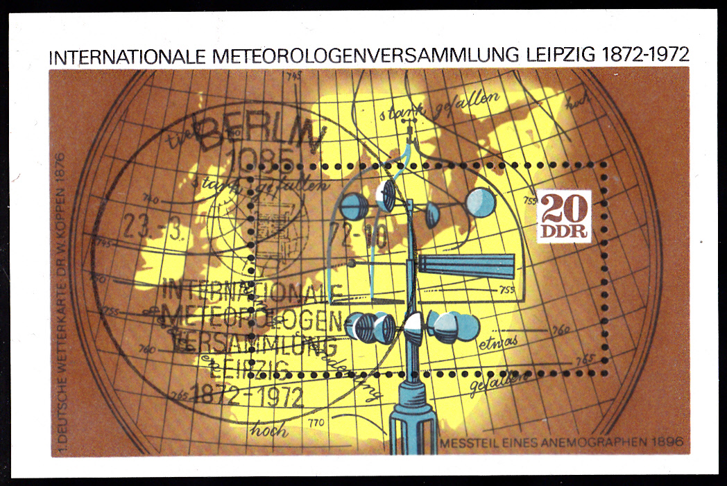 Zum Jubiläum "100 Jahre Meteorologen-Versammlungen Leipzig" erschien in der DDR dieser Block, der das Messteil eines Anemographen (Windmesser) von 1896 und die erste deutsche Wetterkarte von W. Köppen aus dem Jahre 1876 zeigt.