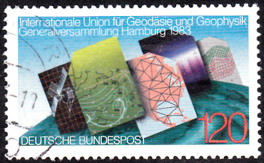 Auf dieser Marke der Deutschen Bundespost zur Generalversammlung der Internationalen Union für Geodäsie und Geophysik (IUGG) in Hamburg wird auch eine Wetterkarte gezeigt.