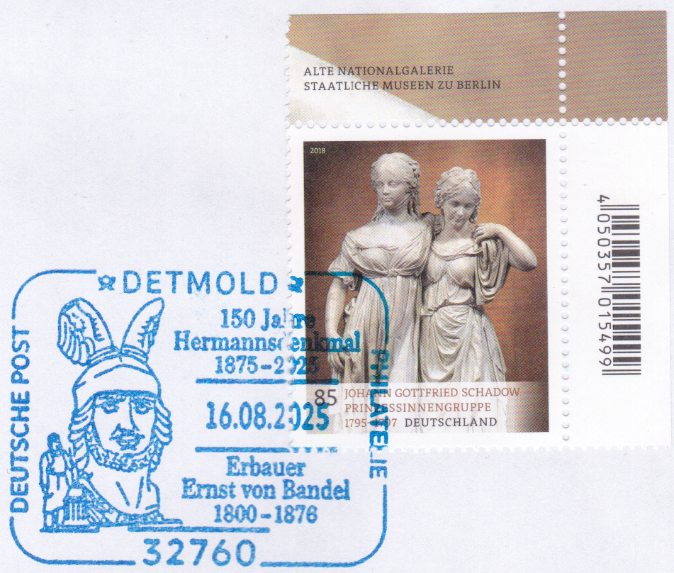 Ergänzend zum hier bereits erwähnten Hermannsdenkmal zeige ich hier einen Brief mit dem Sonderstempel aus Detmold vom 16.8.2025, der an das Jubiläum "150 Jahre Hermannsdenkmal" erinnert.