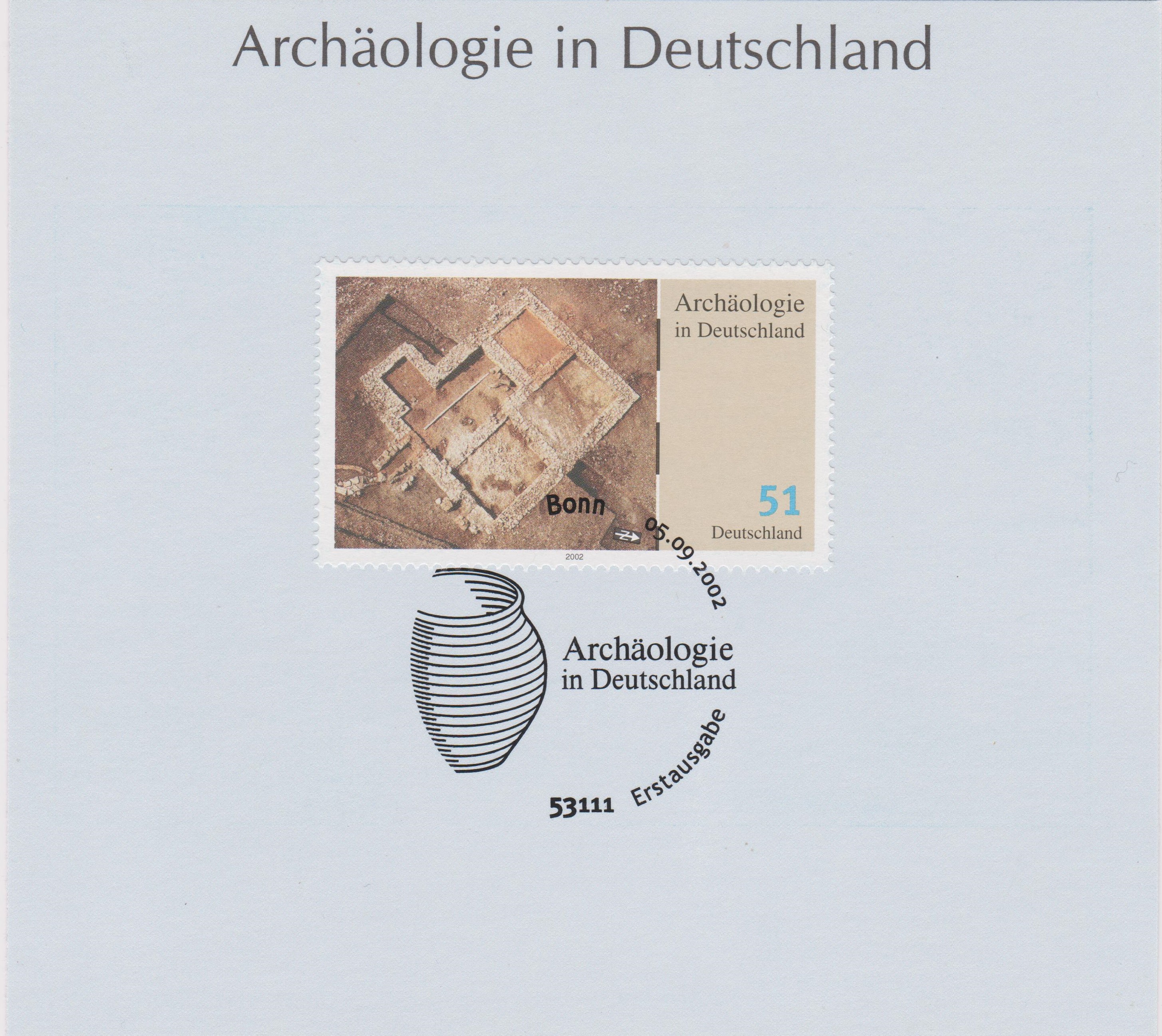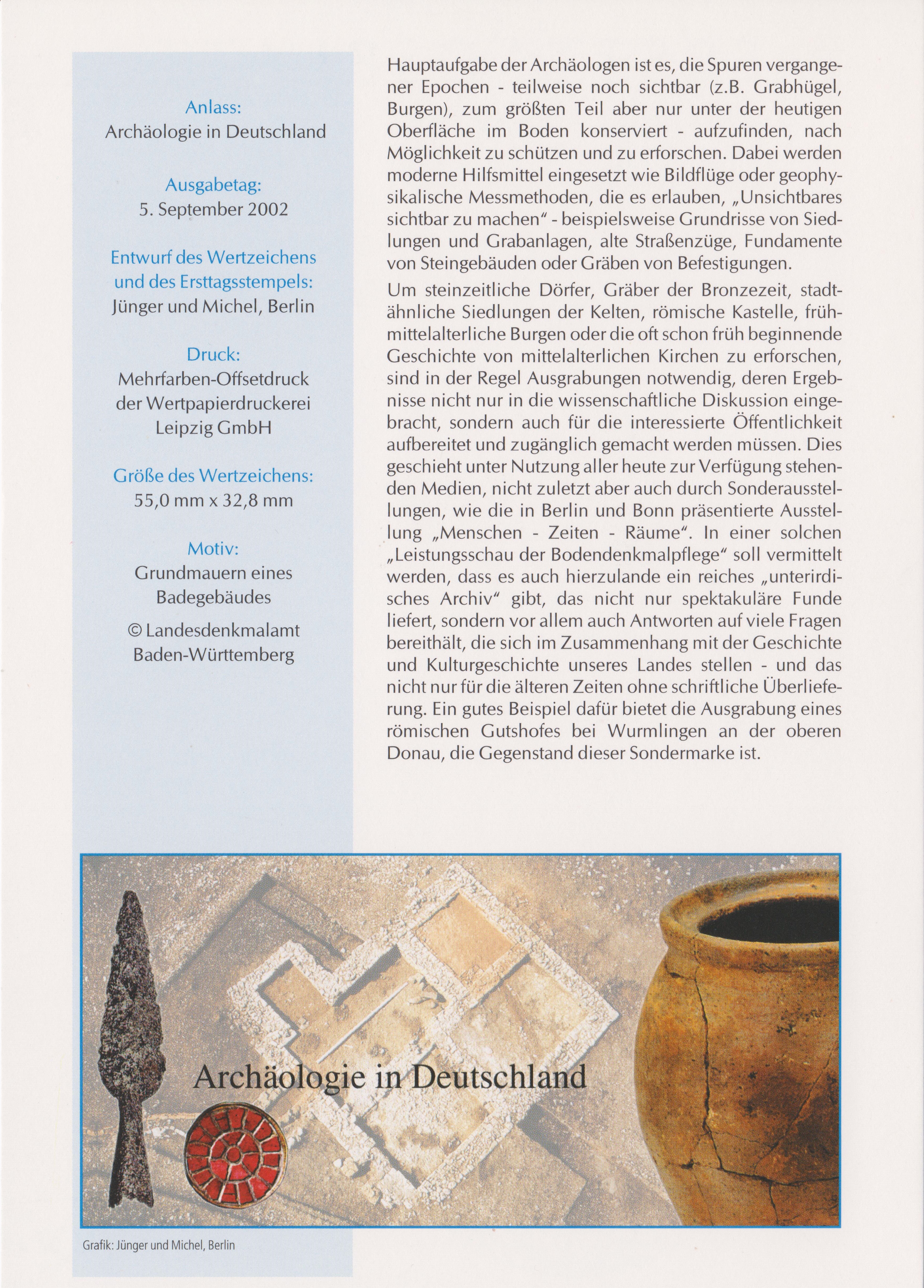 Hier das von Heinz bereits vorgestellte Postwertzeichen, das die in Wurmlingen zu besichtigenden Reste eines römischen Gutshofes sowie eines römischen Bades zeigt. In einer Serie zum Thema "Archäologie in Deutschland" erschien bei der Deutschen Post dieses Postwertzeichen, MiNr. 2281, mit einer Abbildung der Grundmauern des Badegebäudes eines römischen Gutshofes in Wurmlingen mit Pfostenspuren eines danach eingebauten frühalemannischen Speichers (um 260):