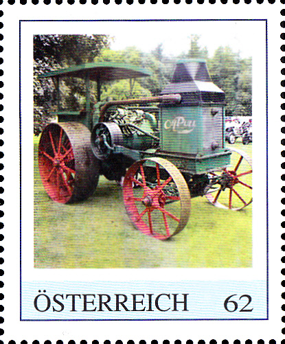 Diese Marke aus Österreich gehört zwar zu den "Marken auf Privatbestellung" wurde aber von der Post selbst in einer Mappe mit dem Titel "Historische Traktoren" verkauft. Sie zeigt einen CASE-Dampftraktor "Black Lady, Baujahr 1911.