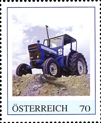 Hier eine Marke aus der gleichen Mappe der österreichischen Post mit der Abbildung eines Ford Traktors.