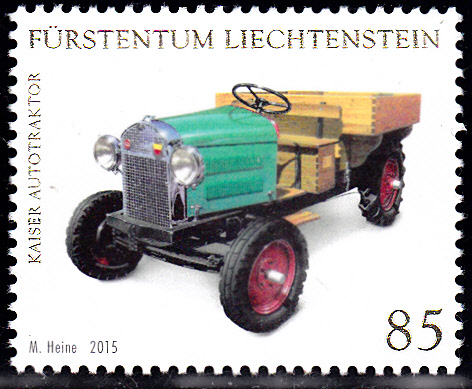 Auf dieser Marke aus Liechtenstein (MiNr 1775) einen Kaiser Autotraktor. Dieser Kaiser Autotraktor wurde 1945 in der Kaiser AG in Schaanwald gefertigt. Mit seinem Opel Kadett 4-Zylinder-Motor erbrachte das Fahrzeug jahrzehntelang gute Dienste in einem Landwirtschaftsbetrieb.
