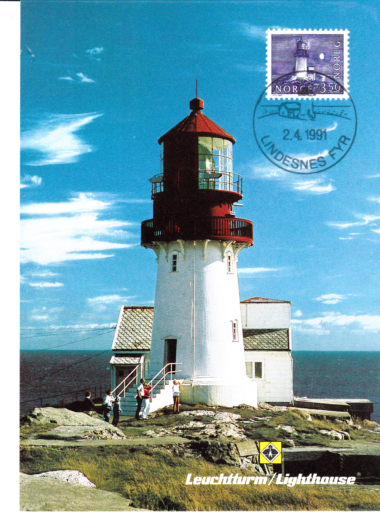 In Norwegen wurde dieser Leuchtturm auf einer Freimarke (MiNr 877) gezeigt. Hier diese Marke auf einer "Maximumkarte" der Firma Leuchtturm mit dem Poststempel "Lindesnes FYR" am 2.4.1991 gestempelt. Im Stempel ist ebenfalls der Leuchtturm zu sehen.