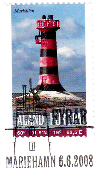 Auf dieser Marke aus Aland (MiNr 296), hier ein Exemplar mit einem Ersttagstempel, wird der Leuchtturm Marhällan abgebildet. Das Nominale der Marke zur Zeit der Ausgabe betrug 0.75 €.