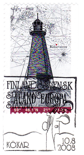 Auf dieser Marke der Alandinseln (MiNr 29ß) ist der alte dreieckige Leuchtturm abgebildet. Der Standort des Turmes ist auf der Karte auf der Marke markiert.