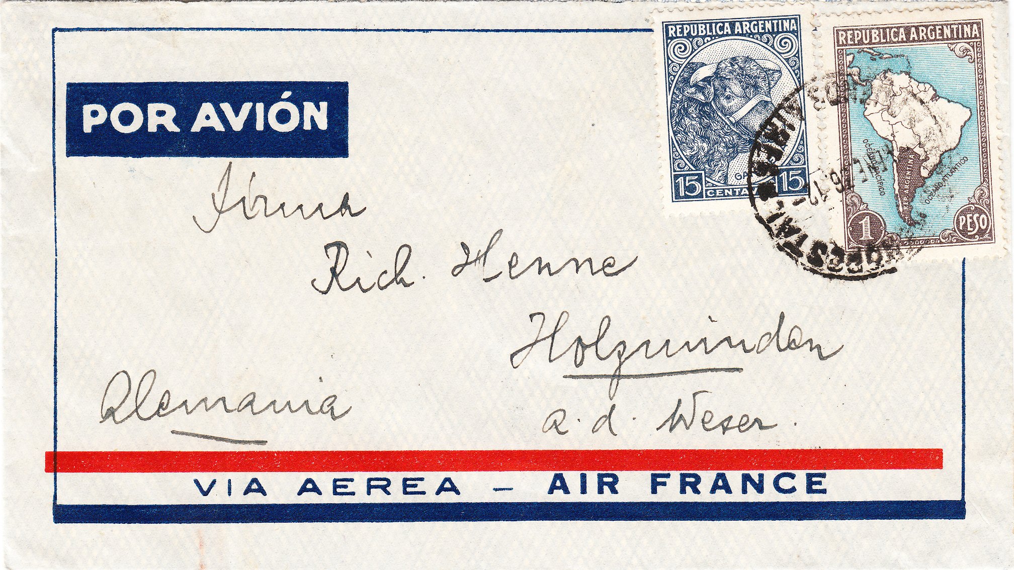 Der an eine Firma Richard Henne in Holzminden an der Weser adressierte Beleg wurde mit einer MiF in Argentinien frankiert und am 04.01.1936 in Buenos Aires aufgegeben.