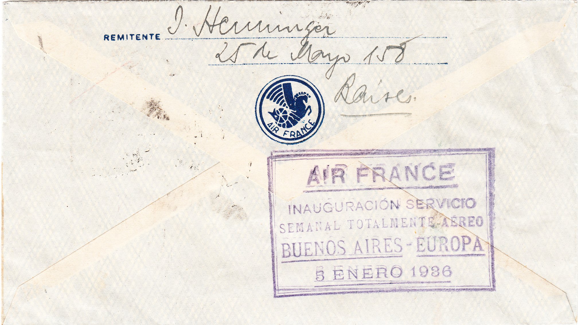 Ein fünfzeiliger Stempel weist darauf hin, dass die Air France ab dem 05.01.1936 wöchentlich die Flugroute von Buenos Aires nach Europa bediente. Dieser Beleg wurde also auf dem Erstflug auf dieser neu eingerichteten Route befördert.