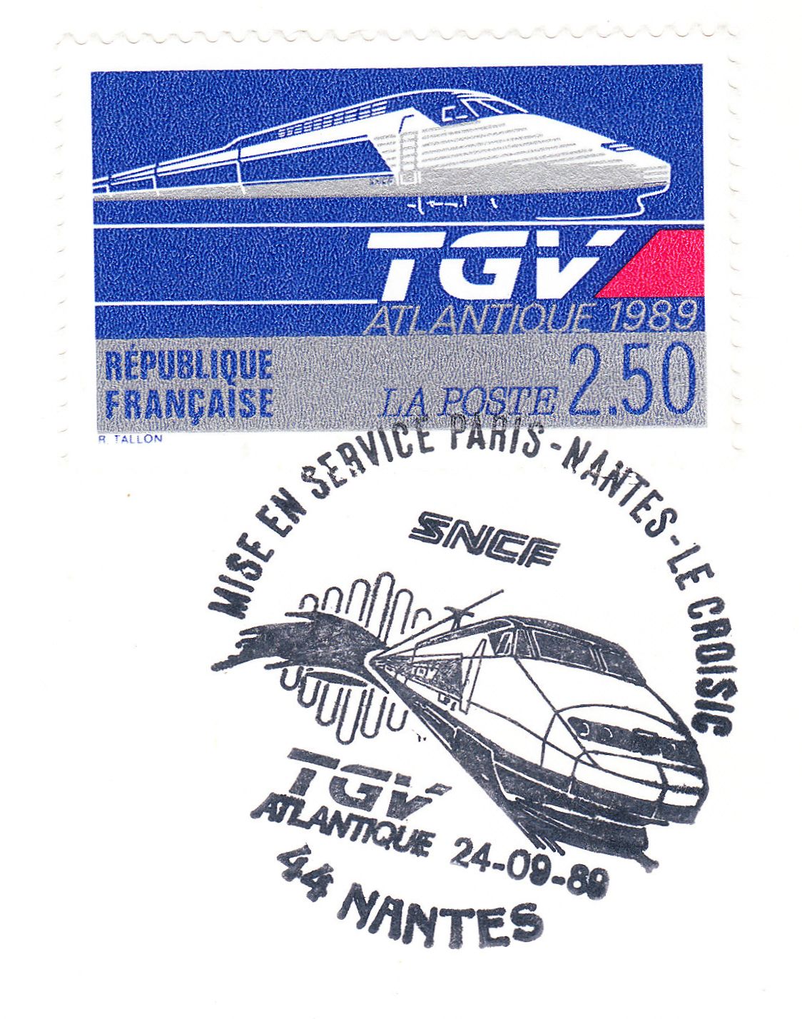 Am 24.09.1989 begann mit zunächst 21 Garnituren der kommerzielle Einsatz des TGV auf der neuen Atlantique - Strecke, was dieser Sonderstempel aus Nantes dokumentiert:
