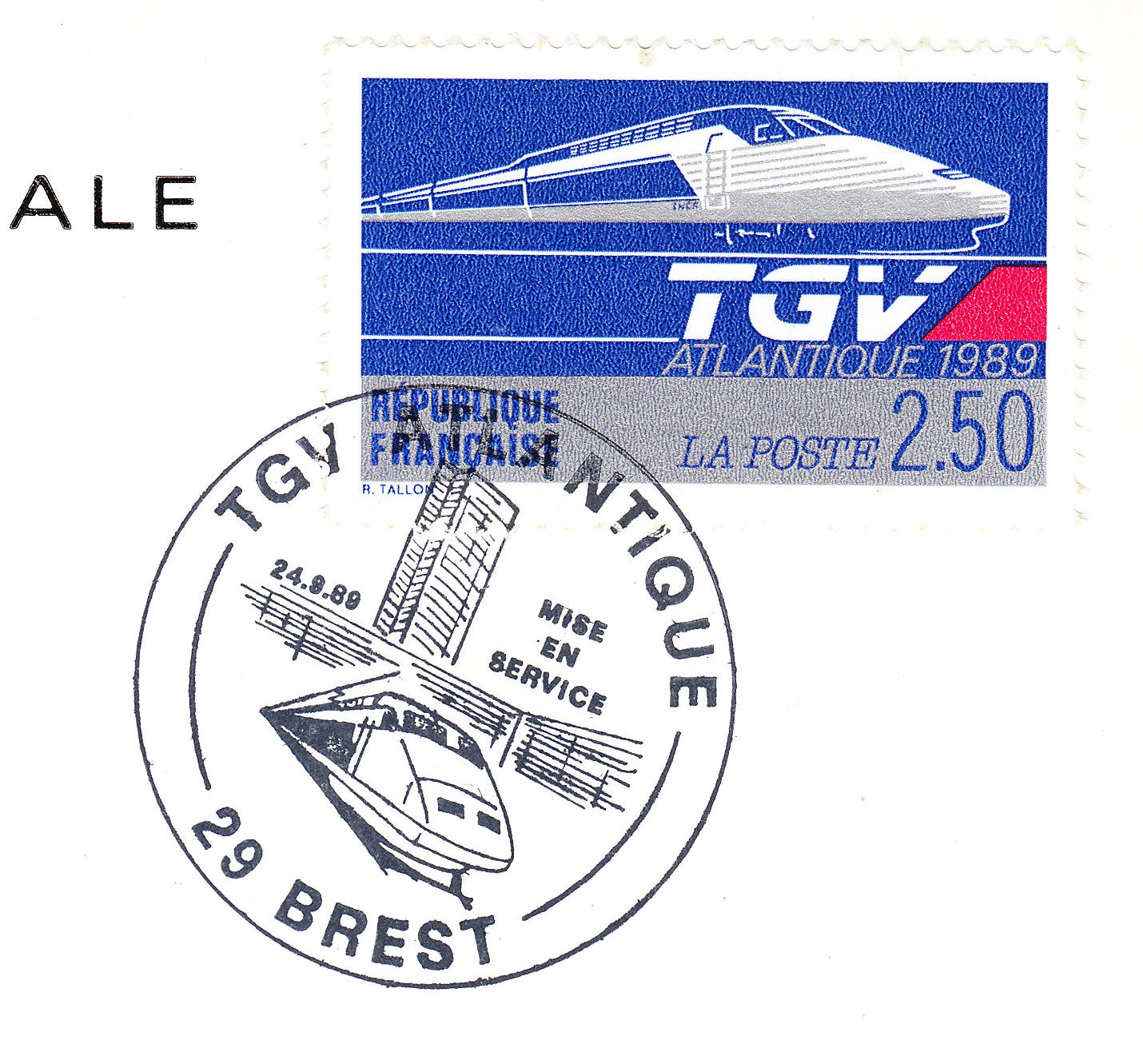 Am 24.09.1989 begann mit zunächst 21 Garnituren der kommerzielle Einsatz des TGV auf der neuen Atlantique - Strecke, was dieser Sonderstempel aus Brest dokumentiert: