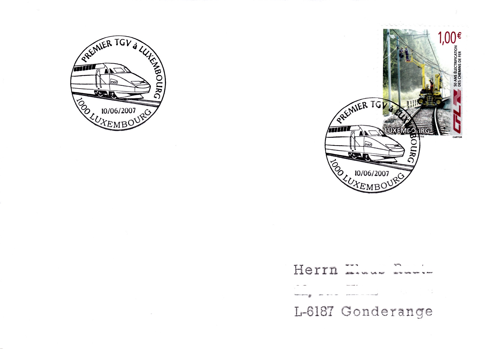 Dieser Sonderstempel vom 10.6.2007 zum ersten TGV in Luxemburg zeigt auch einen TGV im Stempelbild.