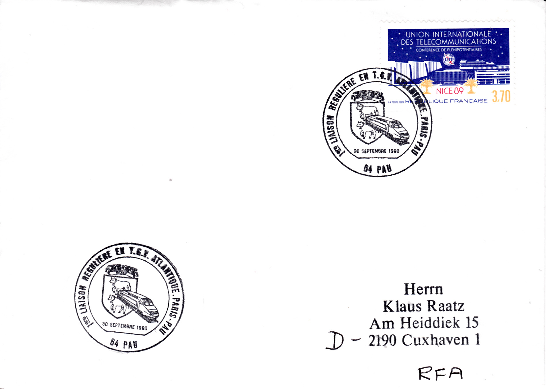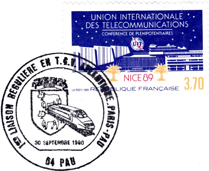 Sonderstempel vom 30.9.1990 aus Pau zum ersten Einsatz des TGV París - Pau.