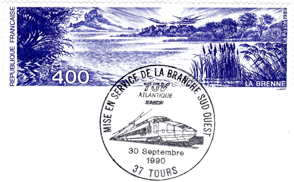 Am 24.09.1989 begann mit zunächst 21 Garnituren der kommerzielle Einsatz des TGV auf der neuen Atlantique - Strecke, was dieser Sonderstempel aus Angers dokumentiert: