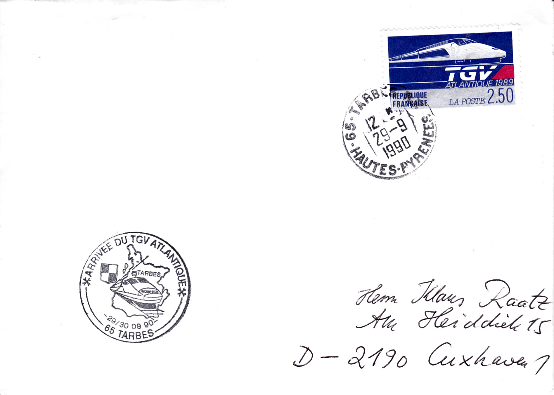 Sonderstempel aus Tarbes vom 29/30.9.1990 zur Ankunft des EGV Atlantique in Tarbes.