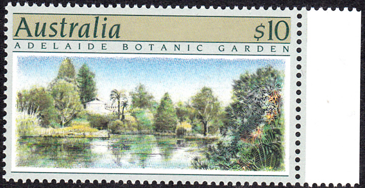 Diese Marke aus Australien (MiNr 1150) zeigt eine Ansicht mit verschiedenen Bäumen aus dem Botanischen Garten in Adelaide.