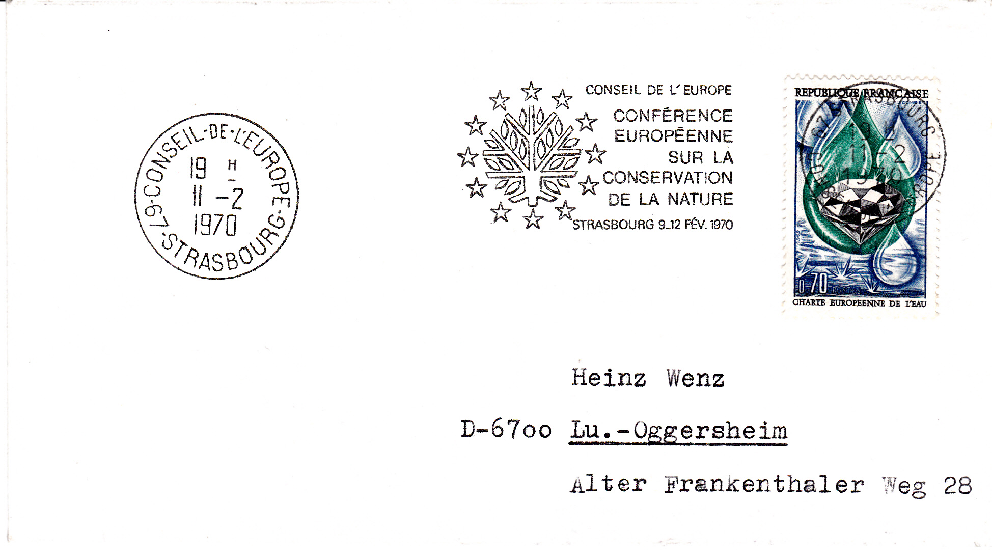 Dieser Maschinenwerbestempel beim Postamt des Europarates in Straßburg zeigt im Werbeeinsatz zum Europäischen Naturschutzjahr 1970 im Signet einen stilisierten Baum.