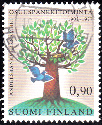 Zum Thema "75 Jahre Genossenschaftsbanken" erschien 1977 in Finnland diese Marke (MiNr 809) mit der Abbildung stilisierter Baum mit Vogelnest und Vögel.