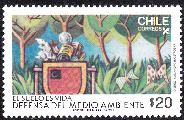 In Chile erschien 1987 eine Serie zum Thema "Umweltschutz". Diese Marke (MiNr 1124) zeigt einen stilisierten Wald und einen Abfalleimer. Die Marke so macht so darauf aufmerksam, dass der Wald keine Müllhalde ist.