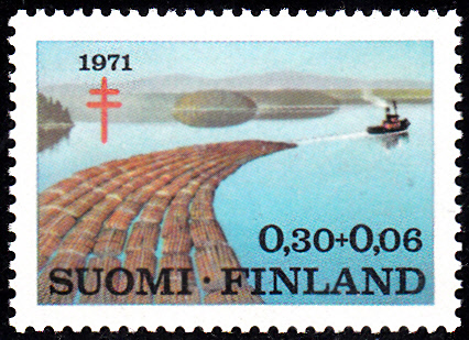 Nach dem Schlagen der Bäume müssen die Stämme zur weiteren Bearbeitung in die Sägewerke transportiert werden. Auf dieser Marke aus Finnland (MiNr 687) wird gezeigt, wie dies auf Flüssen und Kanälen geschehen kann: mit der sogenannten Bundflößerei.