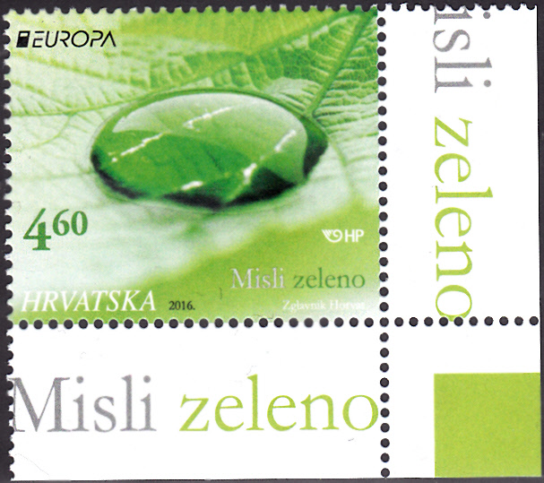 In Kroatien sind die Europamarken 2016 am 9.5.2016 erschienen. Die Marke zu 4,60 K erschien zum Gemeinschaftsthema "Umweltbewusst leben" mit dem Motiv "Wassertropfen auf Blatt" nach einer Graphik von Dubravka Zglavnik Horvat (Kroatien). Die Auflage dieser Marke betrug 300 000 Stück. Hier eine Marke vom rechten unteren Bogenrand: