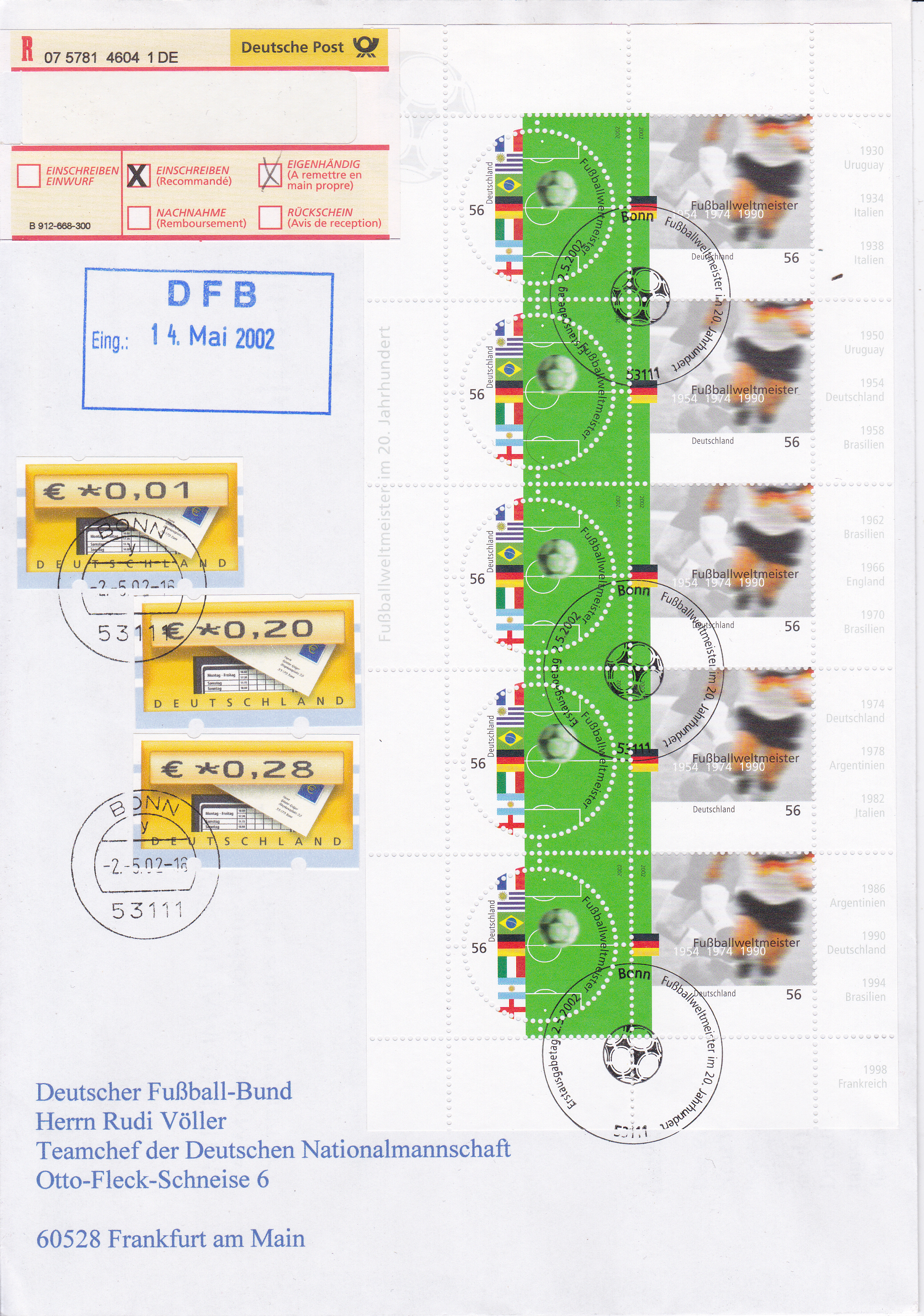 Brief per Einschreiben Eigenhändig mit einem kompletten Bogen aus fünf Zusammendrucken (MiNr 2258/2259) und drei Automatenmarken zu 0,01€, 0,20€ und 0,28 adressiert an den DFB (Rudi Völler) in Frankfurt. Der Kleinbogen ist mit dem Ersttagsonderstempel Bonn gestempelt, die Automatenmarken mit einem Tagessstempel Bonn. Der Brief ist frankiert als Maxibrief 225 Cent, Einschreiben 205 Cent und Eigenhändig 179 Cent, zusammen also 609 Cent.