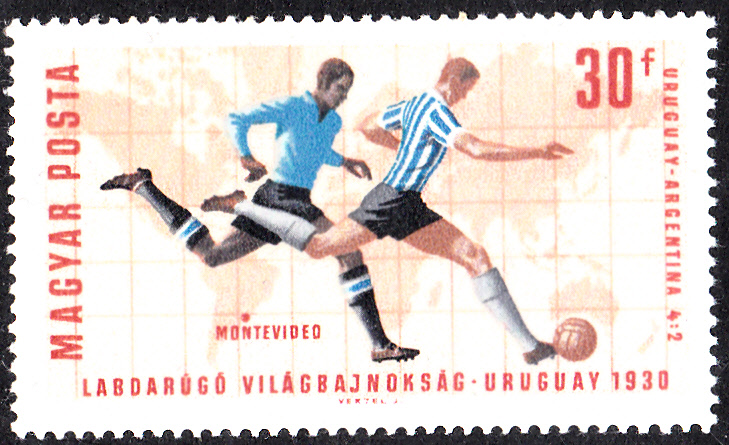 Diese Marke (MiNr 2243 A) aus Ungarn zur Fußball-WM 1966 erinnert an das Endspiel der WM von 1930. Sie zeigt zwei Spieler in den Nationaltrikots von Uruguay und Argentinien vor einer Weltkarte mit dem Endspielort des WM-Finalspiels der WM 1930 und dem Resultat des Spieles Uruguay-Argentinien 4:2.