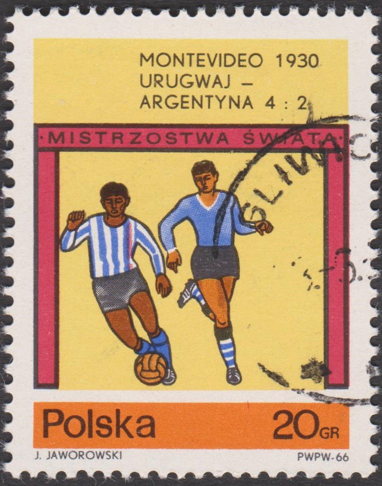 Polen MiNr. 1665 zeigt eine Spielszene aus dem Finale der WM 1930, das Uruguay gegen Argentinien 4:2 gewann: