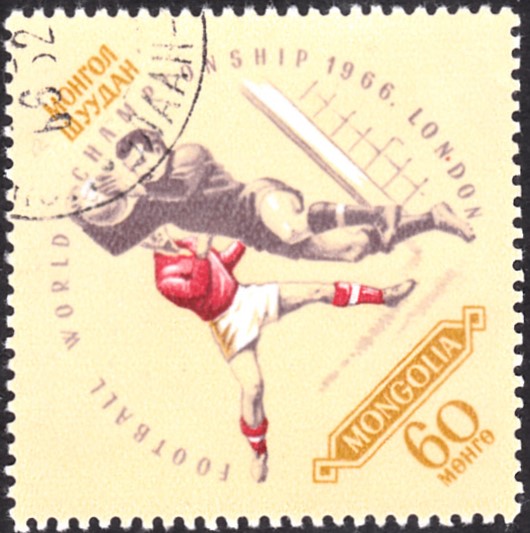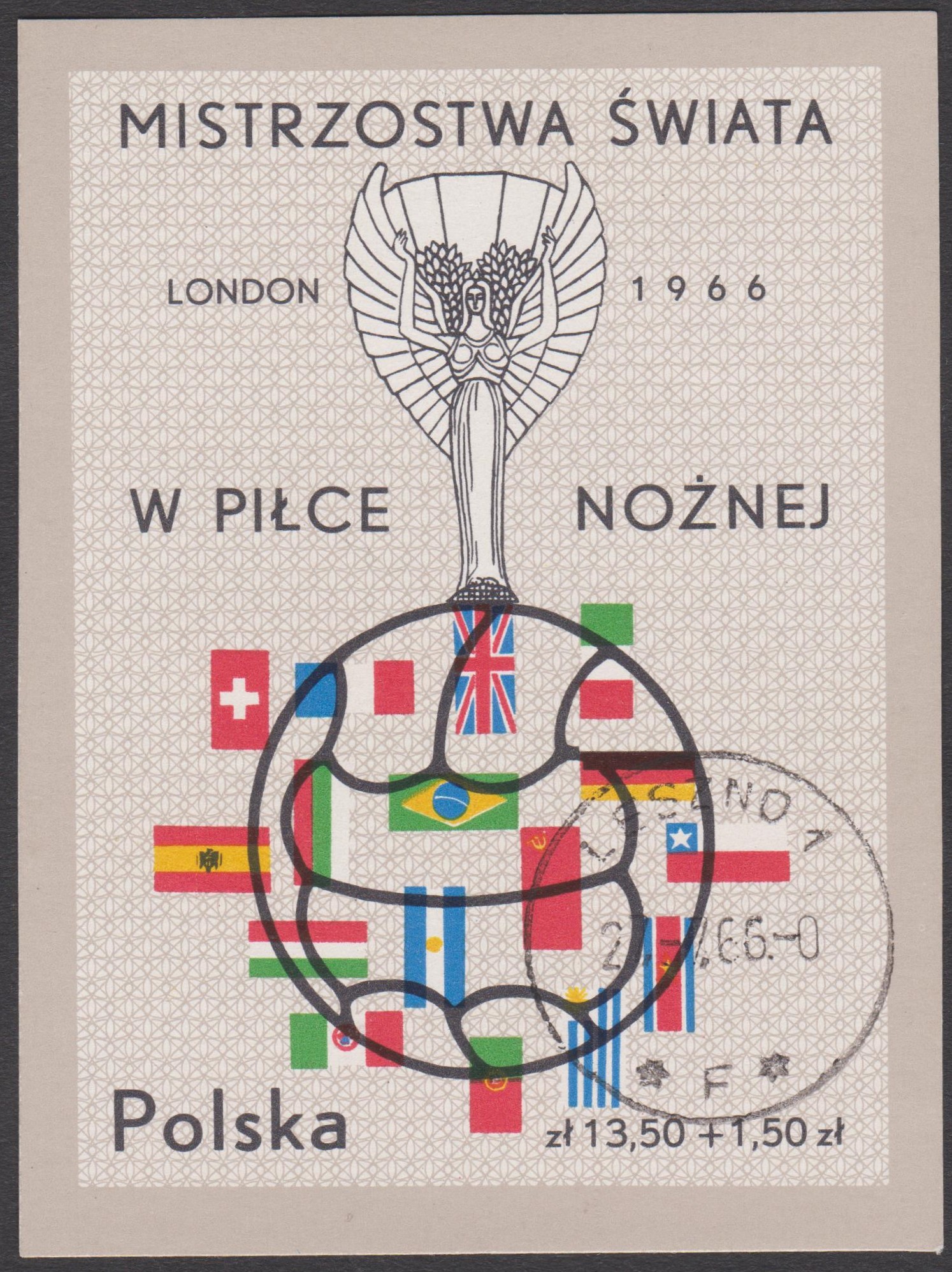Polen Block 38 zeigt die Flaggen der an der WM 1966 teilnehmenden 16 Nationen: