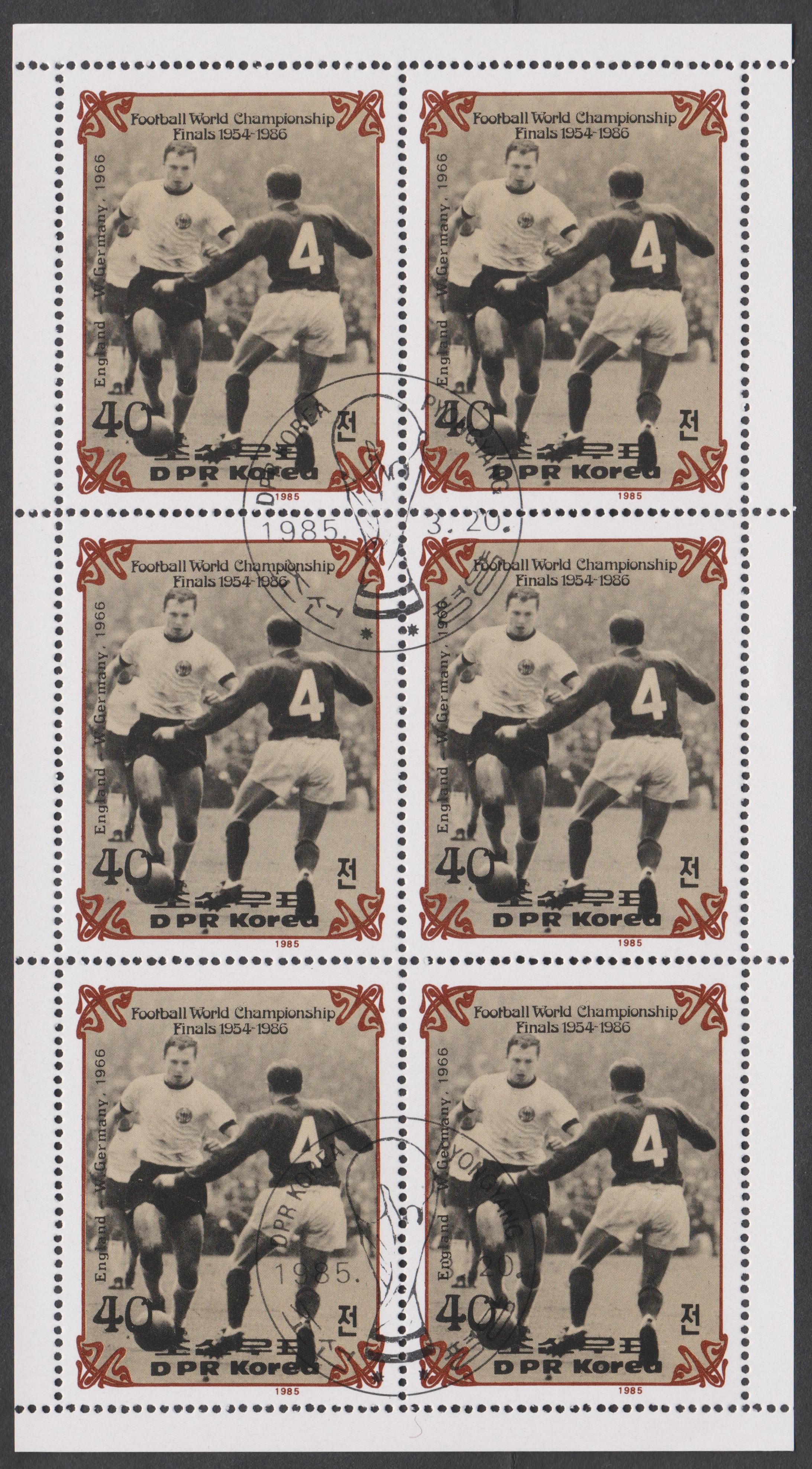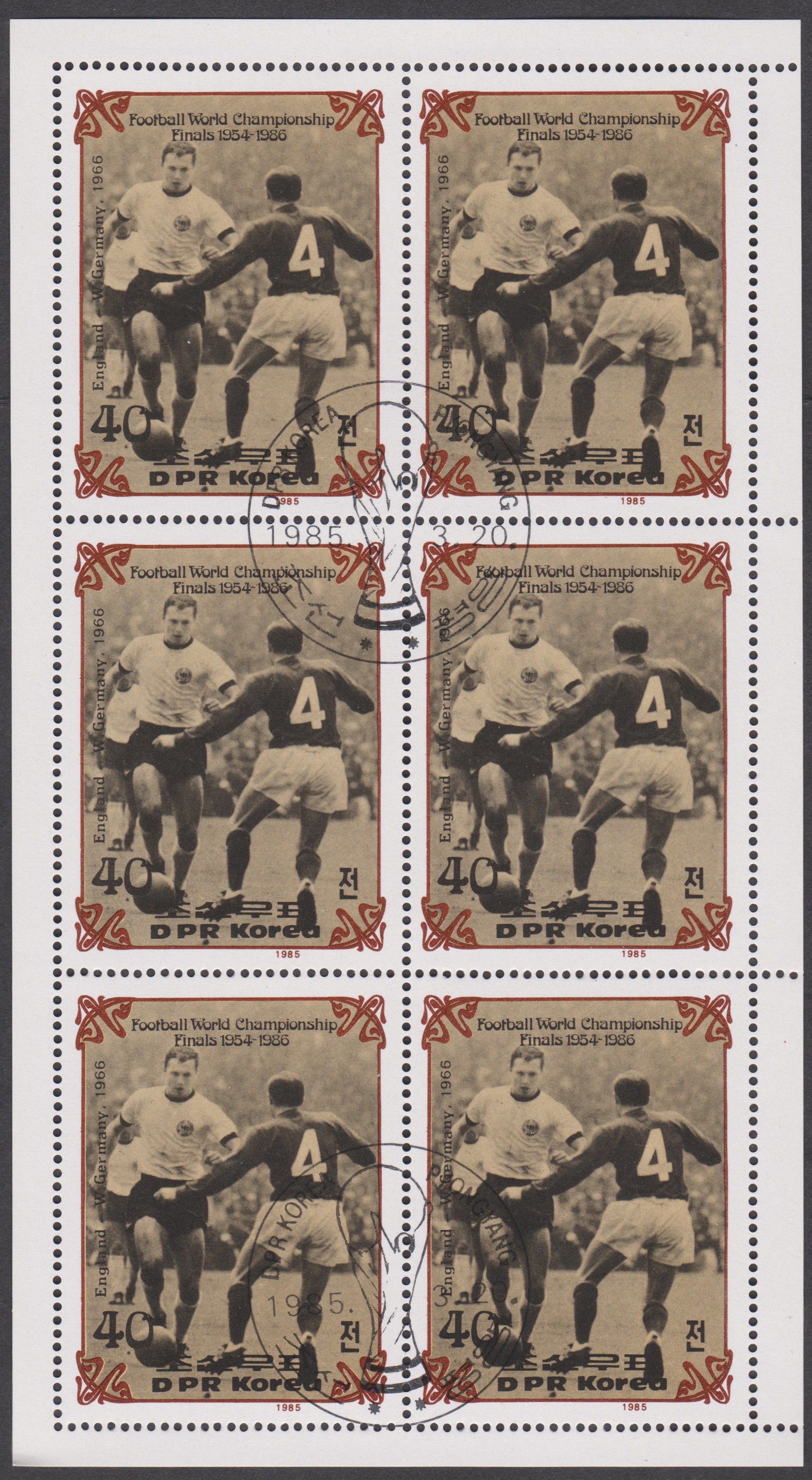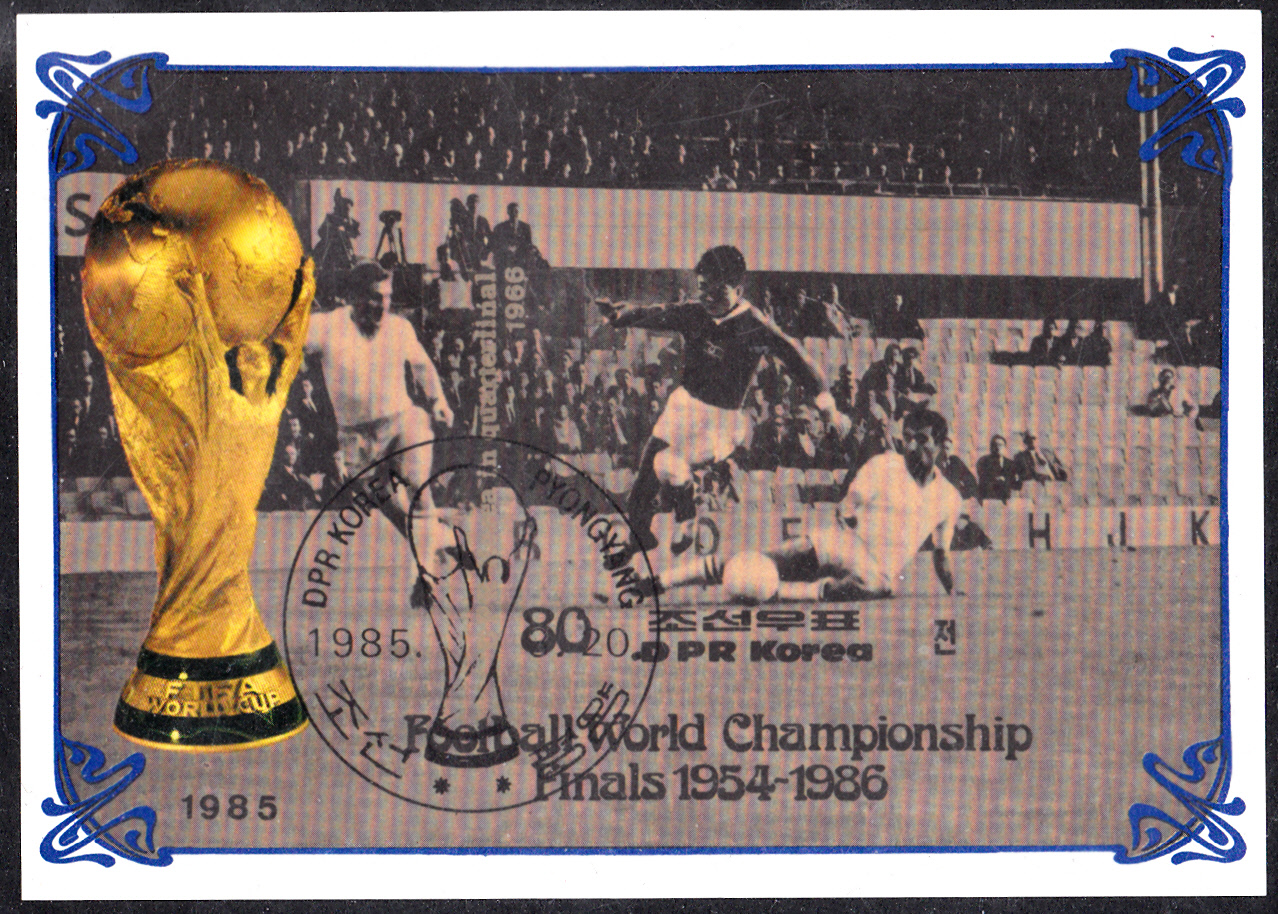1985 erschien in Korea-Nord eine Serie mit Motiven zu den Endspielen der Fußballweltmeisterschaften 1954-1966. Hier auf diesem Block (MiNr Block 198) ist laut Michel eine Szene aus dem Endspiel England-Bundesrepublik Deutschland zu sehen.