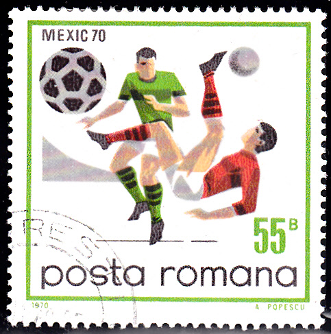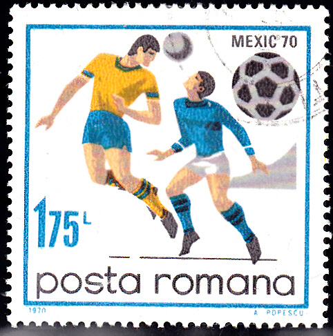 In Rumänien gab es auch eine Markenausgabe zur Fußball WM 1970 in Mexiko. Hier die erste Marke der Serie zu 40 Bani (MiNr 2842) mit einem Zweikampf um den Ball.