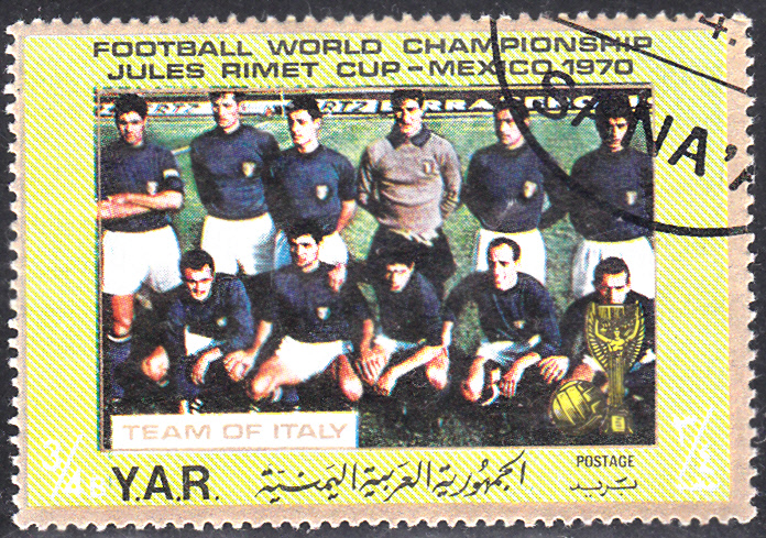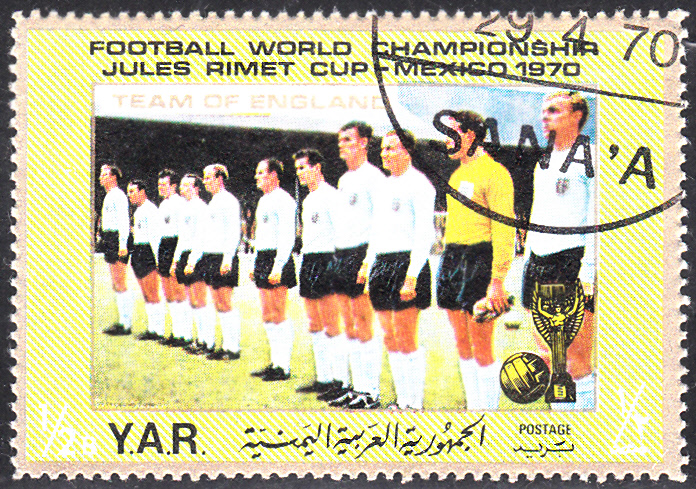 Im Jemen-Nord (Arab. Republik) erschienen zur WM 1970 unter anderem auch zwei Serien mit Mannschaftsbildern von teilnehmenden Nationalmannschaften. Hier eine Marke (MiNr 1147) mit einem Bild der Mannschaft von England.