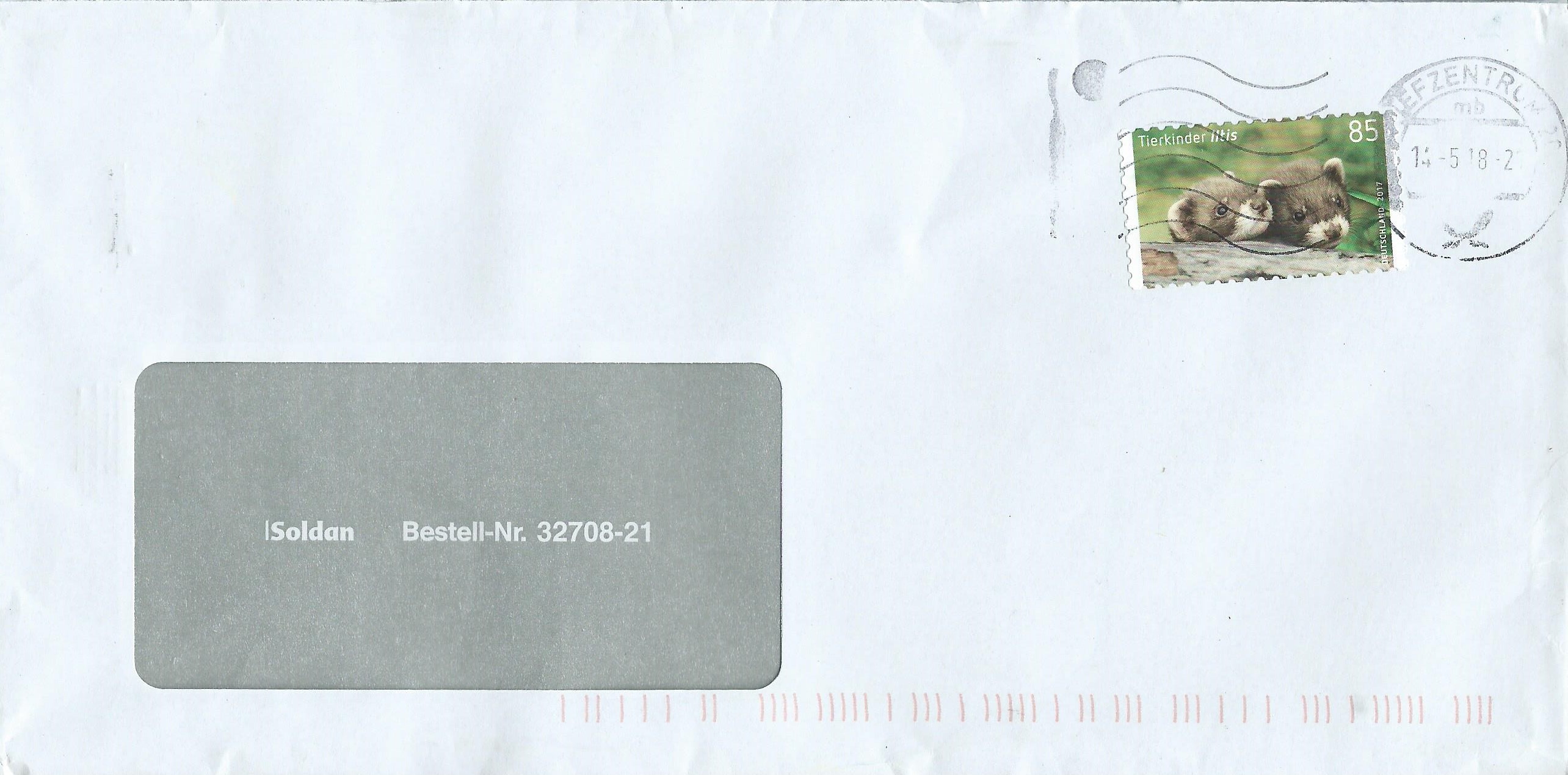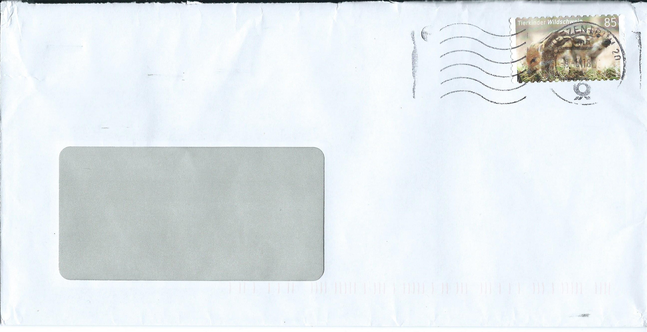 an Belegen mit dem Schraubenkopfabdruck aus dem Briefzentrum 20 habe ich noch weitere Stücke erhalten können. Der erste datiert vom 9.5.18 und hat die selbstklebende Marke zu 85 ct mit dem Wildschweinmotiv als Frankatur: