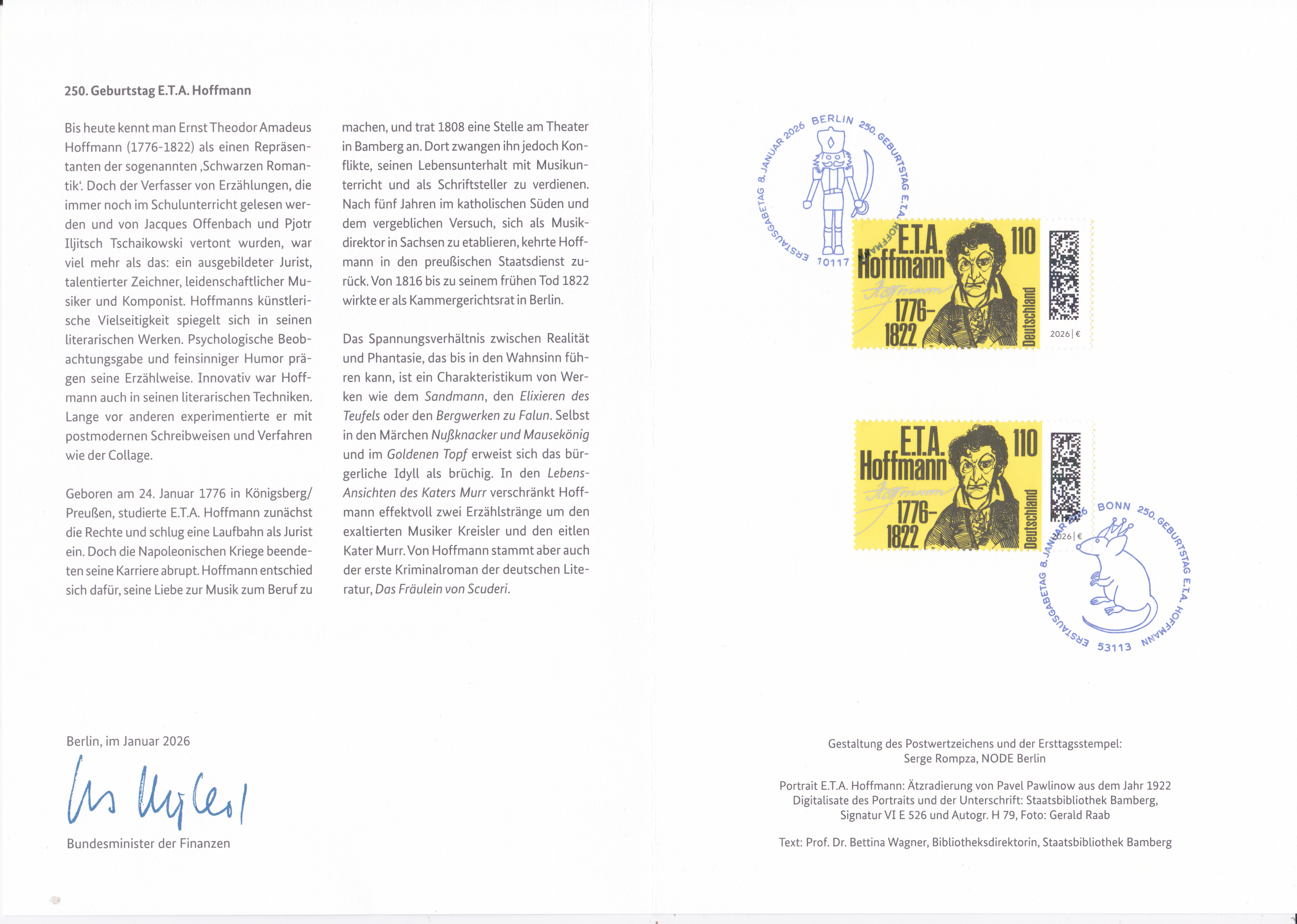 Ministerkarte des Bundesministers für Finanzen mit zwei Marken zum 250. Geburtstag von E.T.A. Hoffmann (MiNr 3944) und den beiden Ersttagsonderstempel Bonn und Berlin.