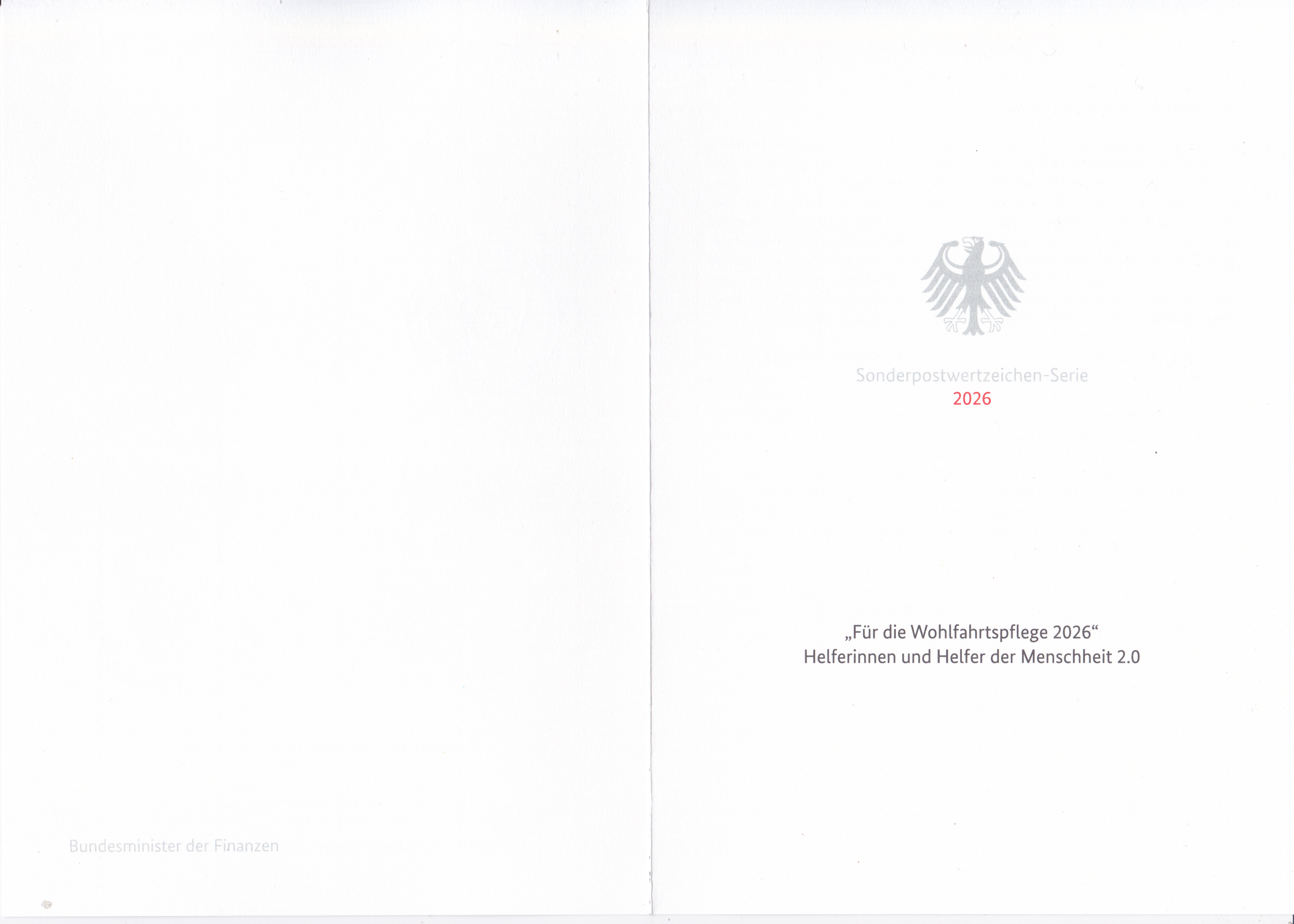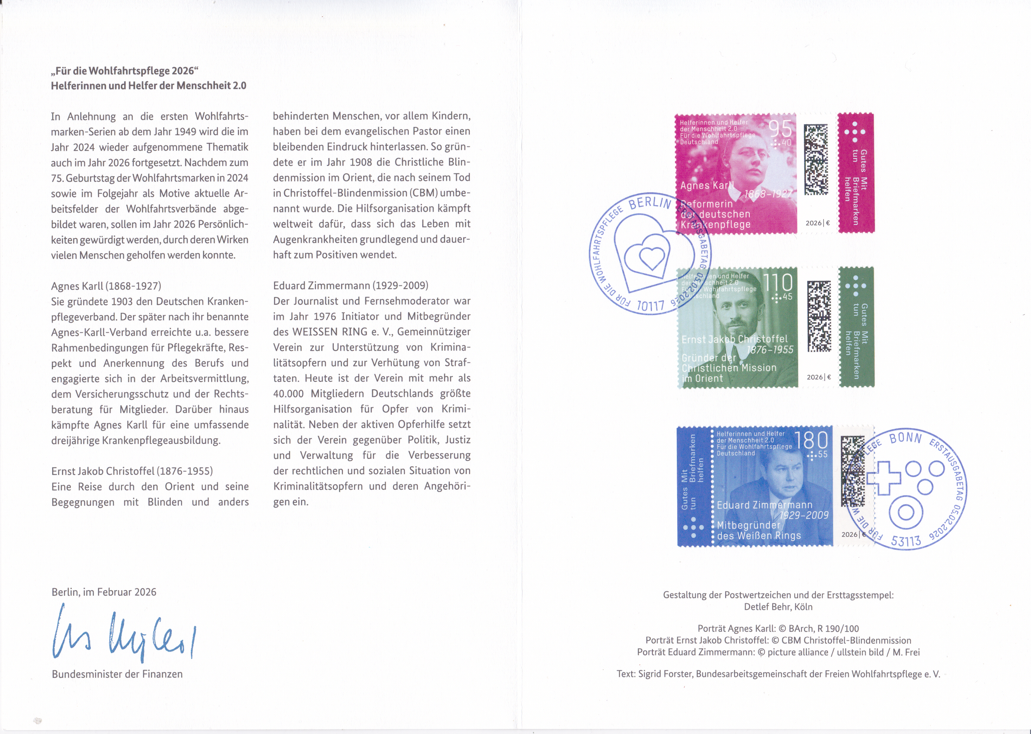Ministerkarte des Finanzministers mit den drei Wohlfahrtsmarken 2026 (MiNr 3945 bis 3947) mit Motiven zum Thema "Helferinnen und Helfer der Menschheit" und den beiden Ersttagsonderstempel Bonn und Berlin.