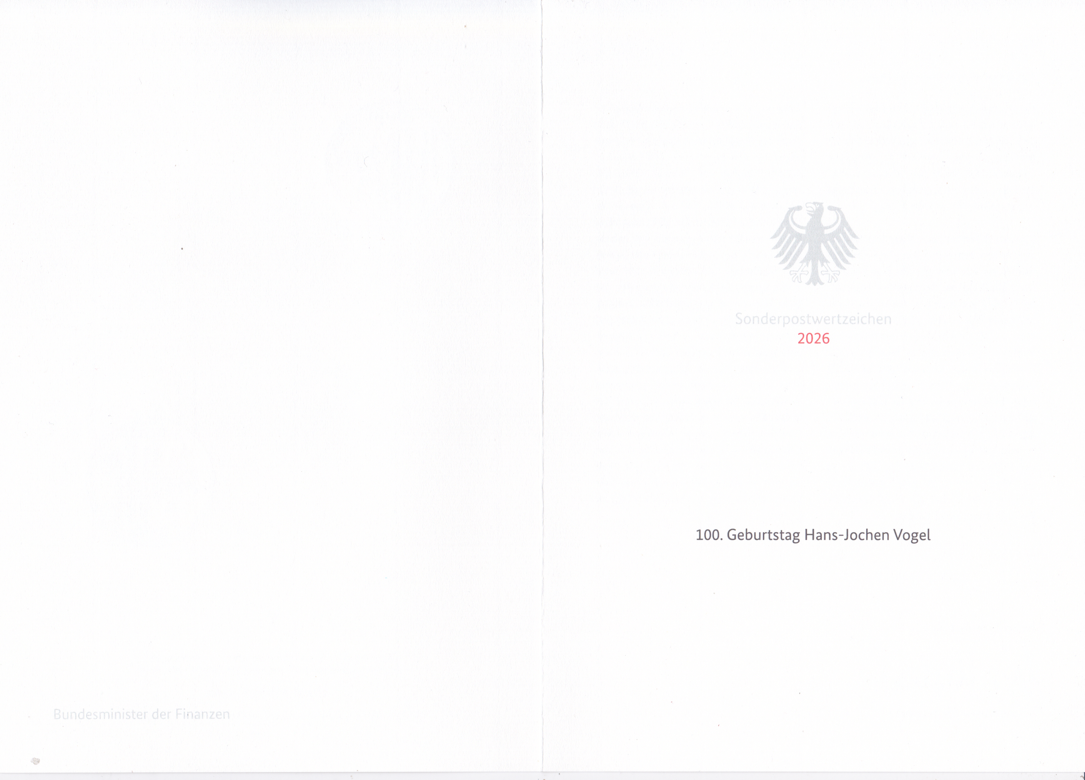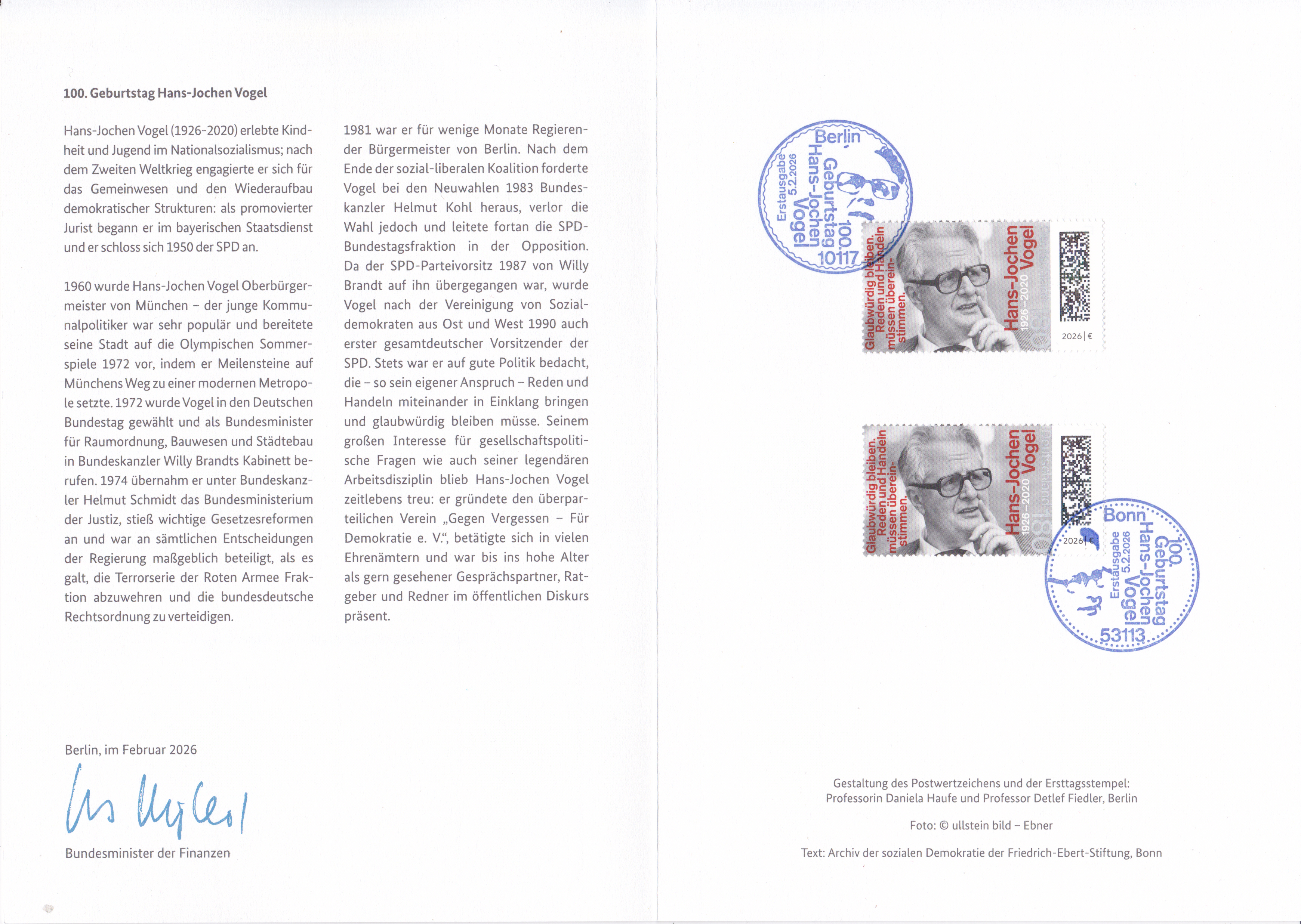 Ministerkarte des Bundesministers für Finanzen mit zwei Marken zum 100. Geburtstag von Hans-Jochen Vogel (MiNr 3948) und den beiden Ersttagsonderstempel Bonn und Berlin.