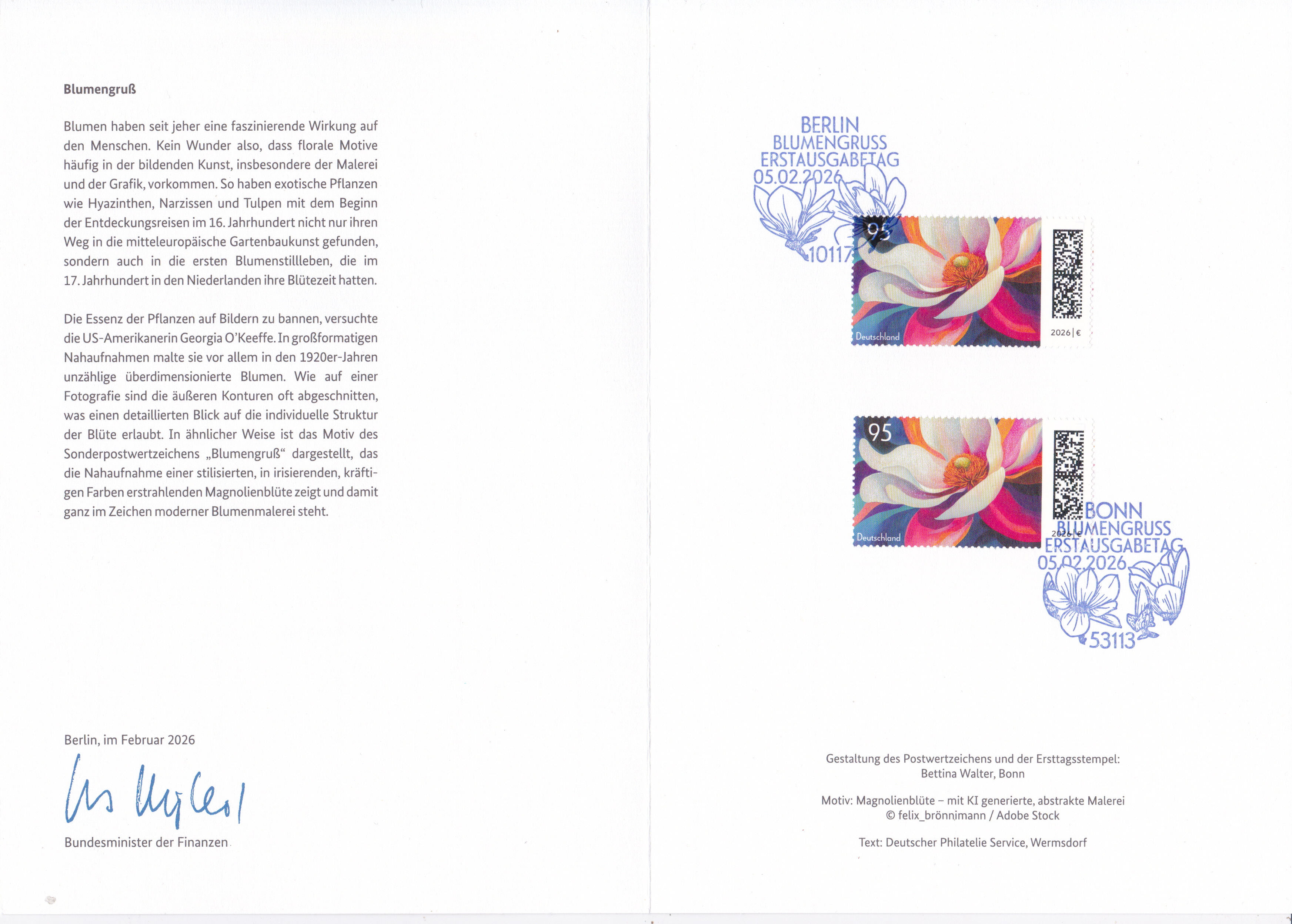 Ministerkarte des Bundesministers für Finanzen mit zwei Marken "Blumengruß" (MiNr 3949) mit der Abbildung einer Tulpen-Magnolie (Magnolia x soulangeana) und den beiden Ersttagsonderstempel Bonn und Berlin.