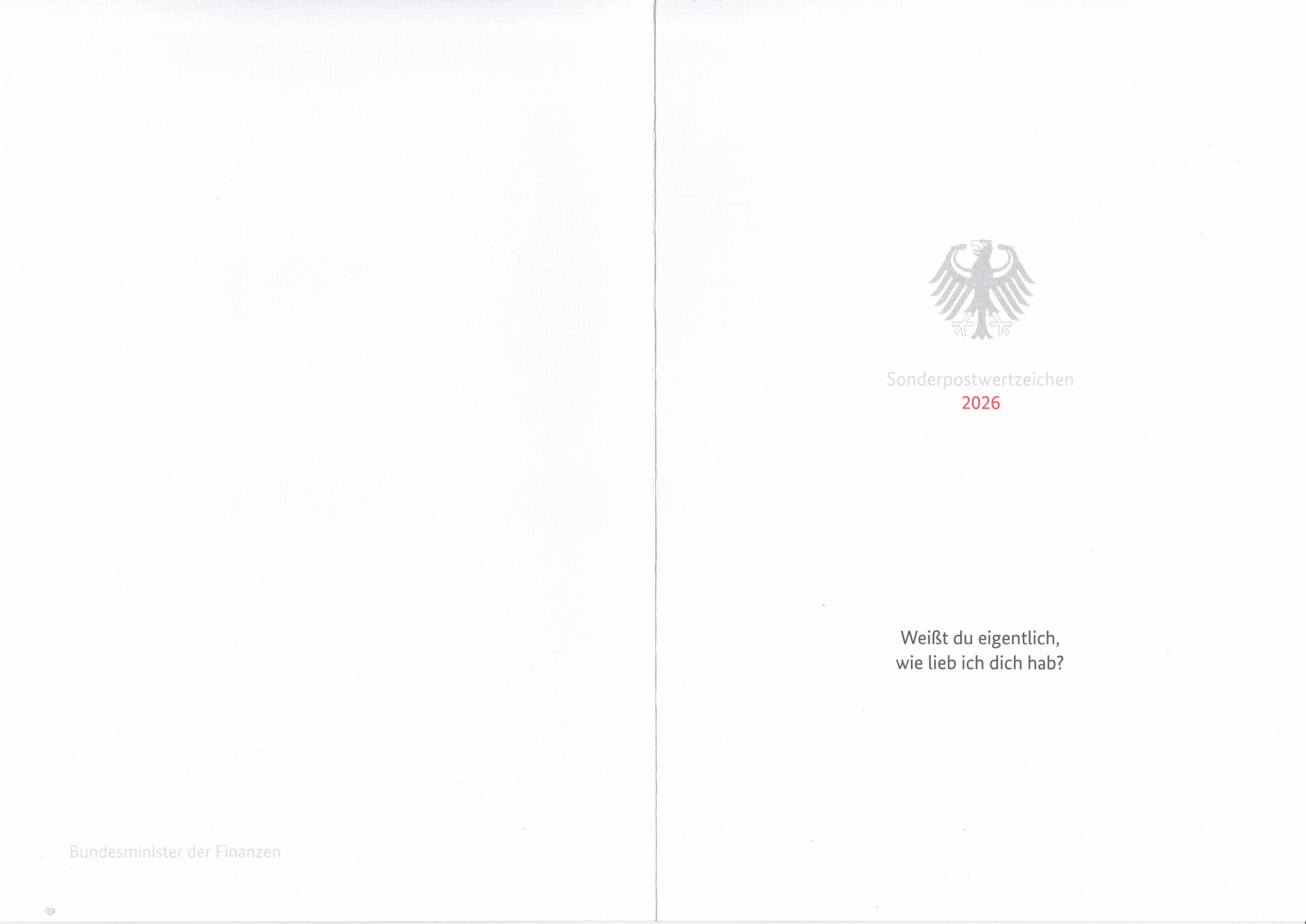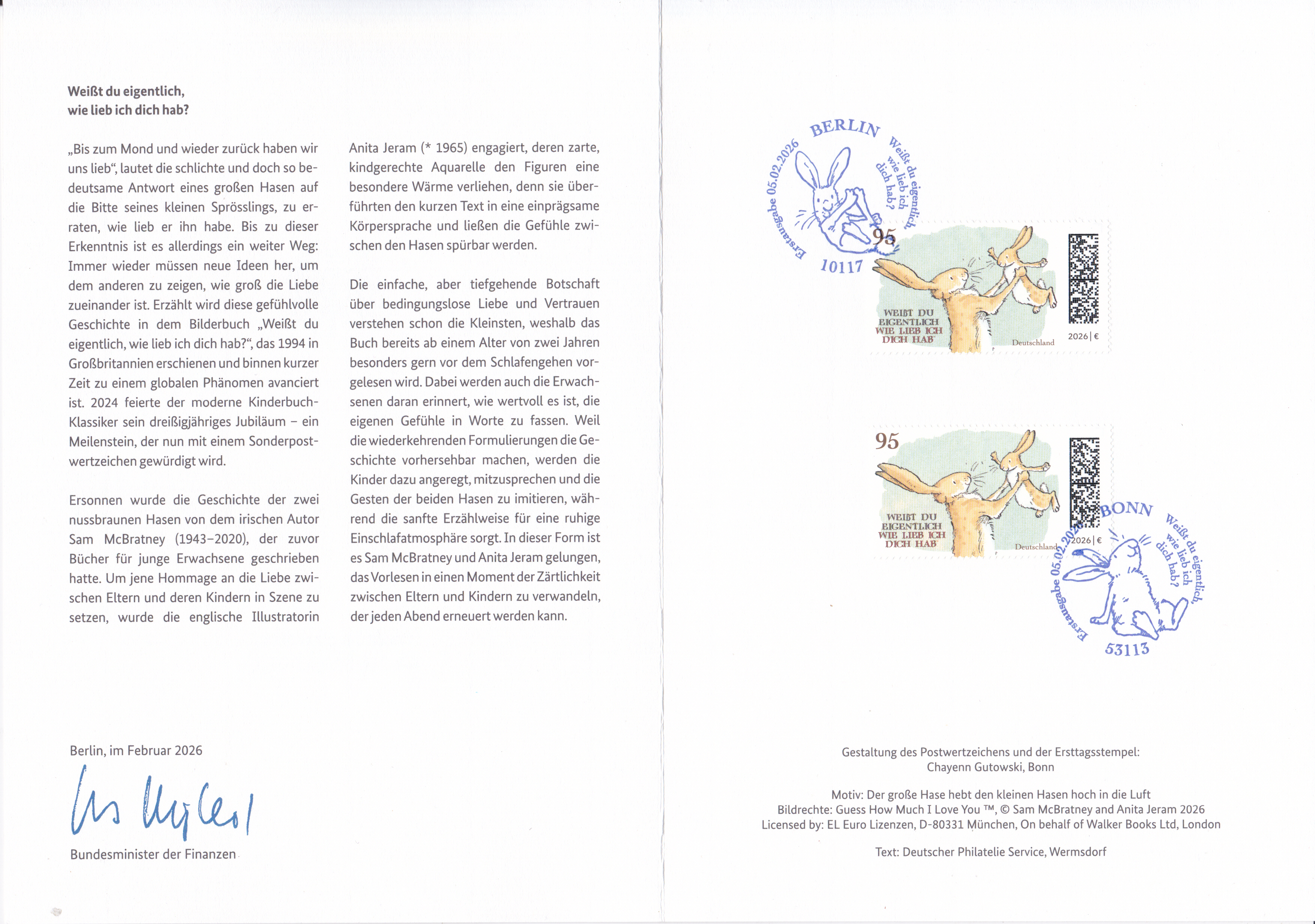 Ministerkarte des Bundesministers für Finanzen mit zwei Marken "Weißt du eigentlich, wie lieb ich dich hab?" (MiNr 3950) mit der Abbildung "Großer und kleiner Hase" aus dem Kinderbuch "Weißt du eigentlich, wie lieb ich dich hab?" und den beiden Ersttagsonderstempel Bonn und Berlin.