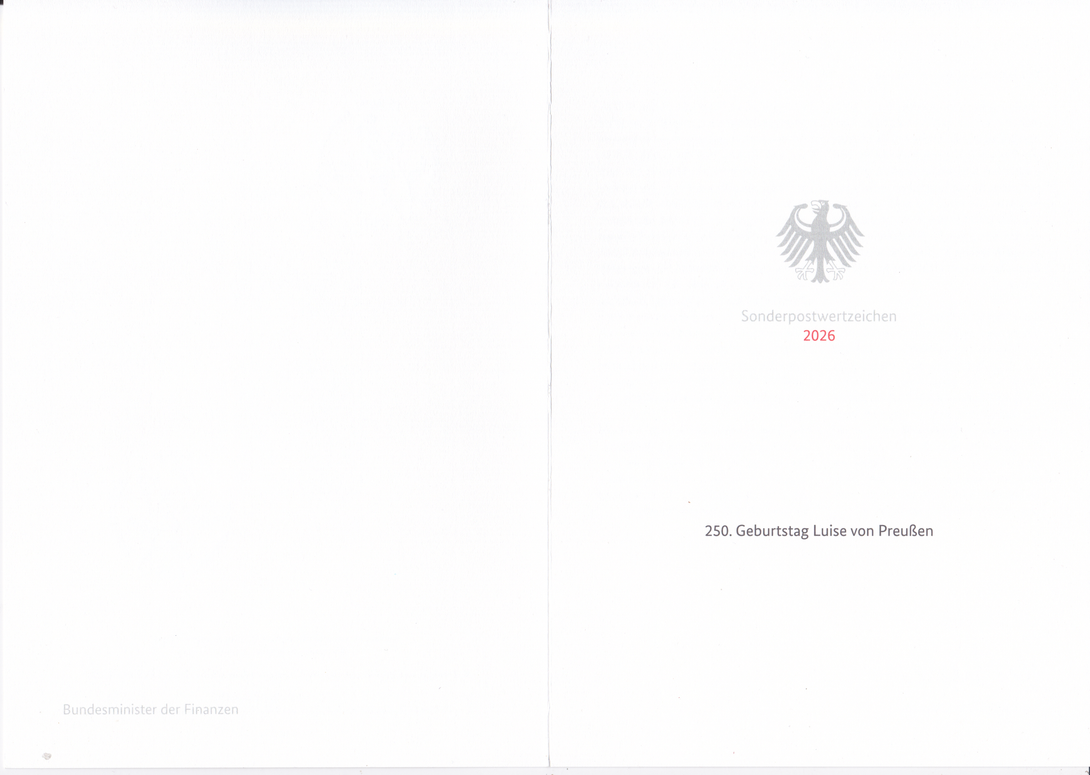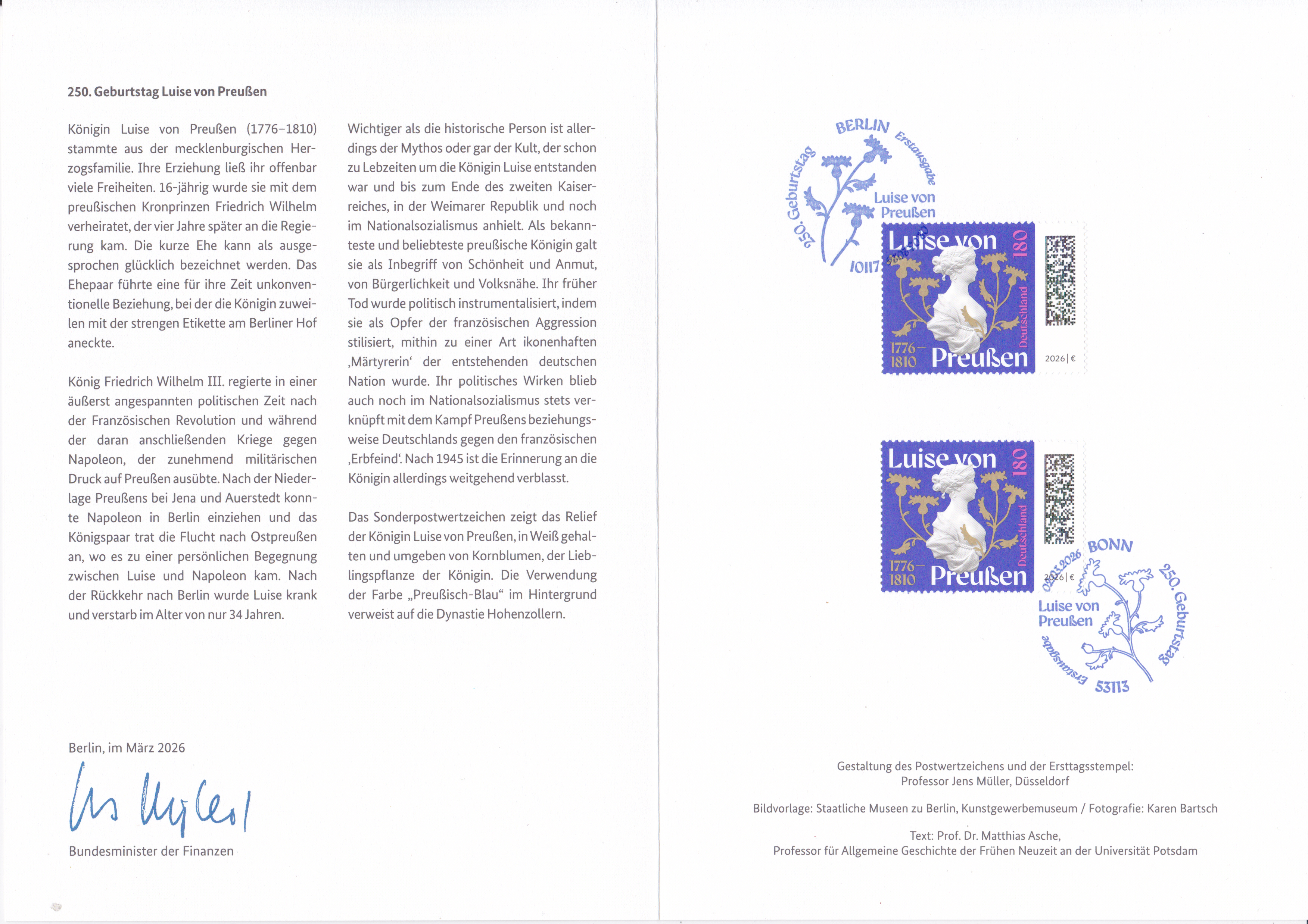 Ministerkarte des Bundesministers für Finanzen mit zwei Marken zum 250. Geburtstag von Luise von Preußen (MiNr 3955) mit der Abbildung eines Porzellan-Reliefs Luise von Preußens (1776–1810), Königin von Preußen und Kornblumensilhouetten und den beiden Ersttagsonderstempel Bonn und Berlin.