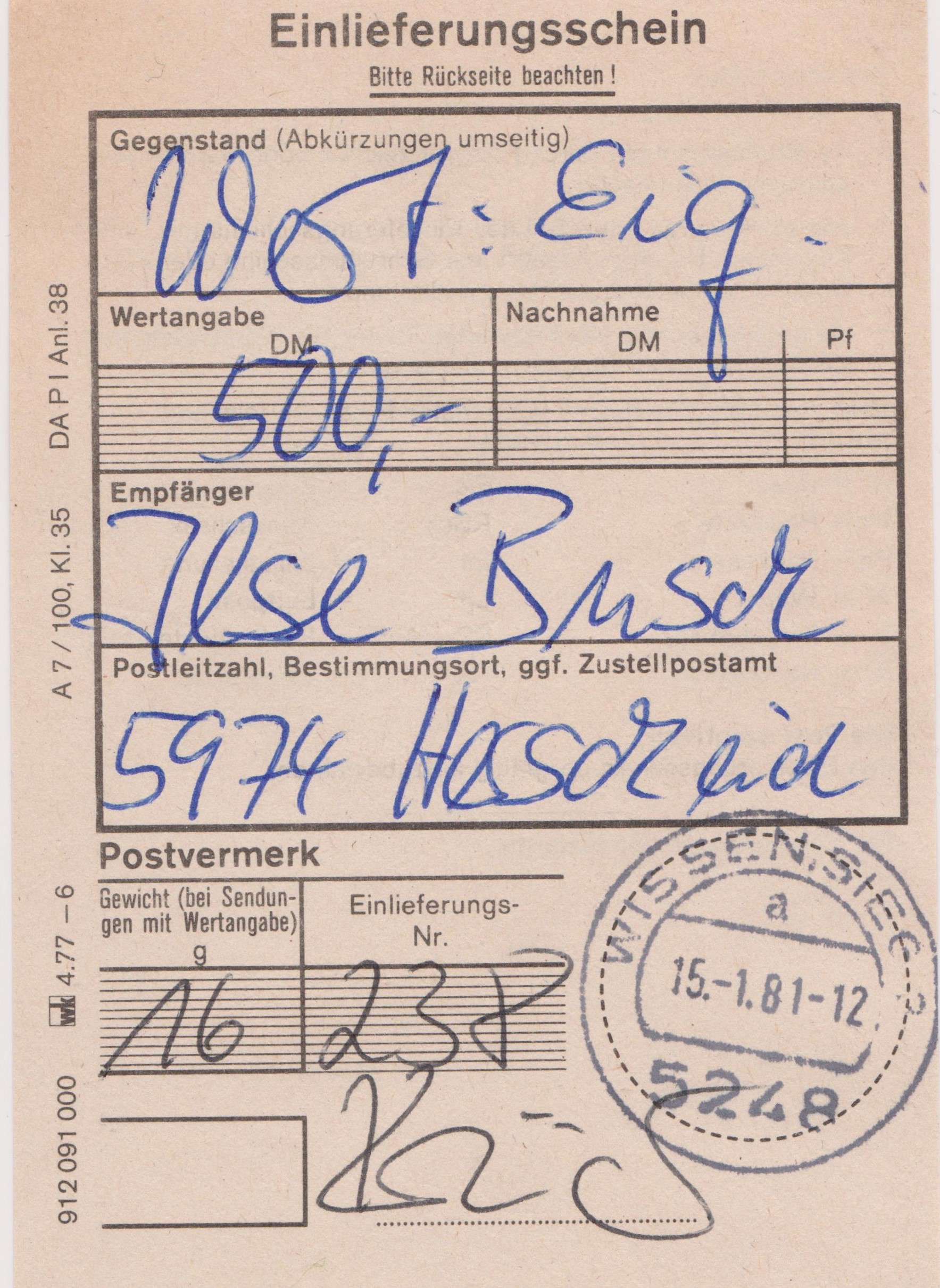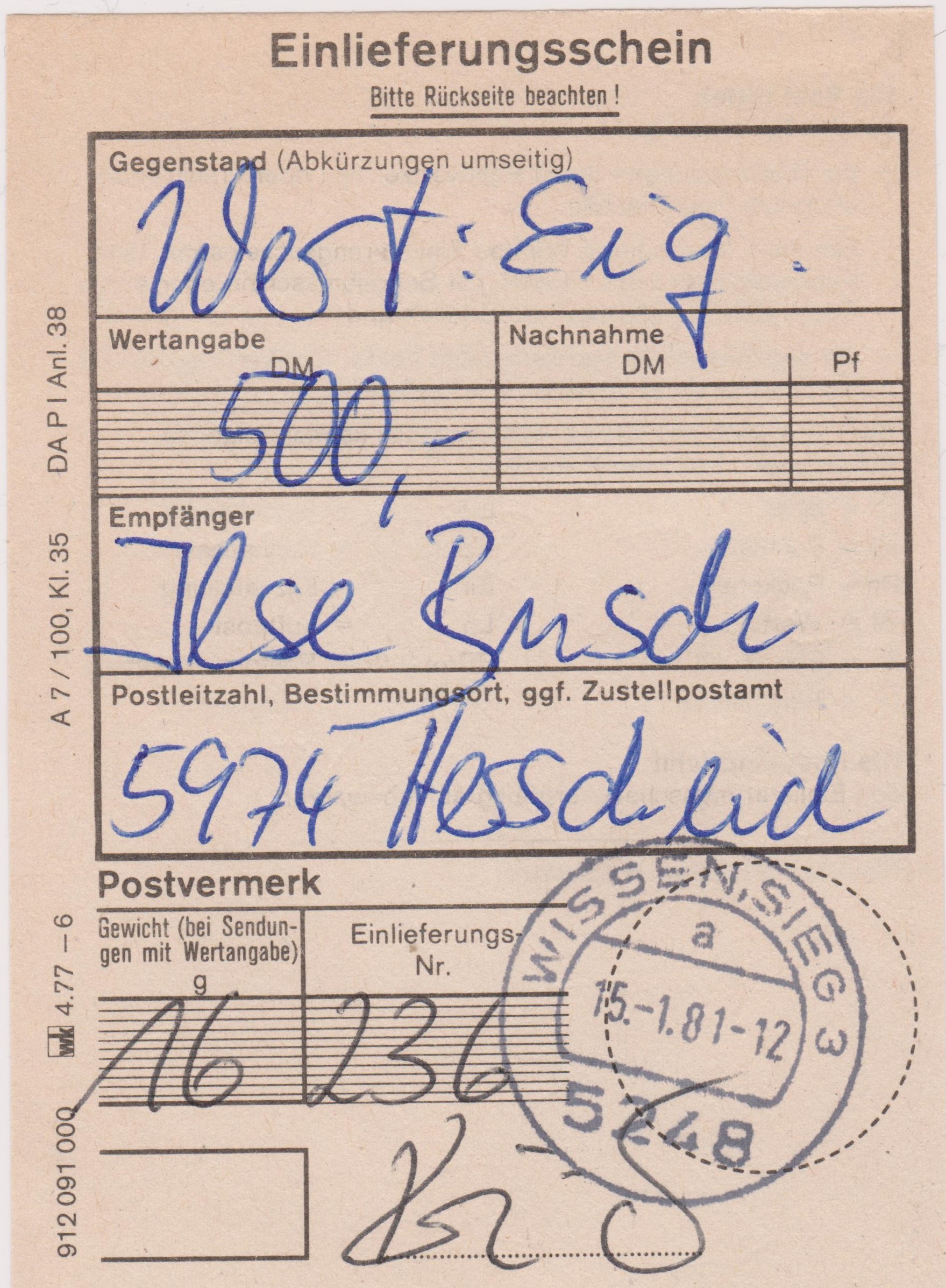 480 Pfennig Porto entsprechen exakt dem Porto für einen Brief im Fernverkehr bis 20 g in Höhe von 60 Pfennig plus 300 Pf Versicherungsgebühr je 500 DM Wertangabe plus 120 Pfennig für die zustellung "eigenhändig"!