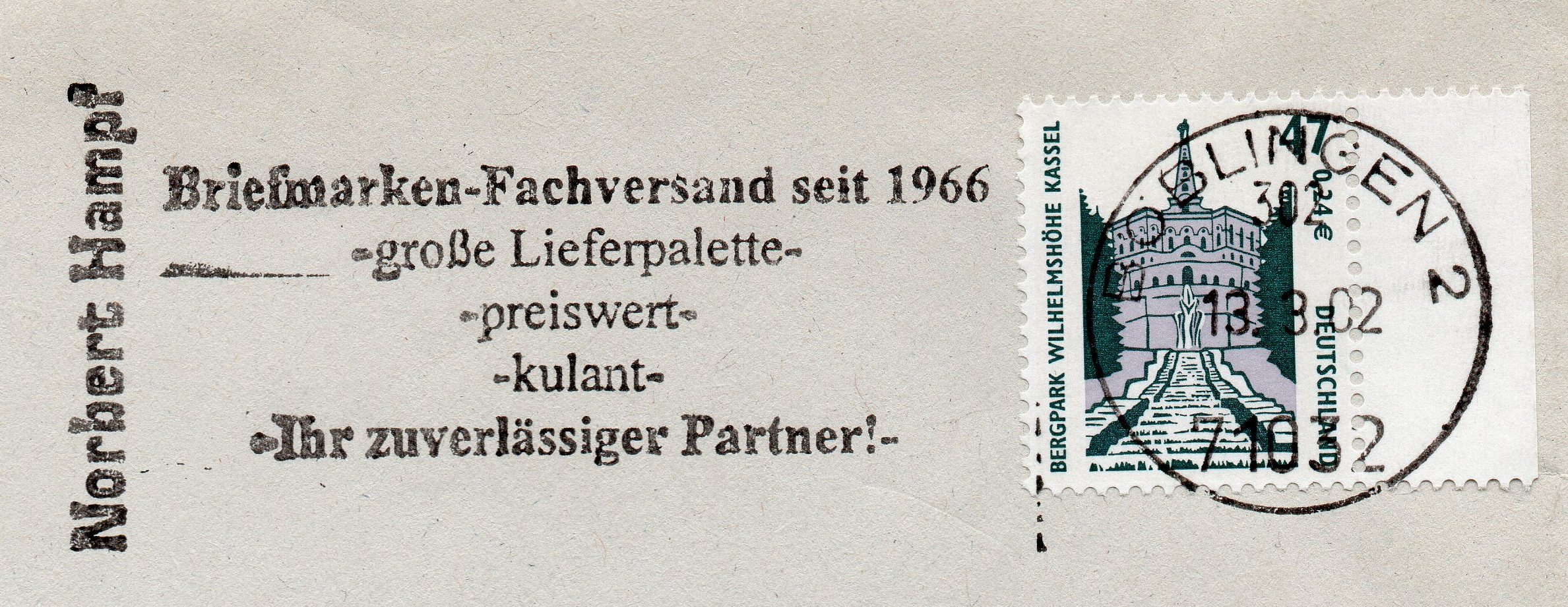 Hier noch der versprochene blaue Stempel, leider nur auf Einzelmarke und nicht auf Briefstück oder Brief, daher unvollständig. Der Stempeltyp ist etwas anders, aber auch hier wurde ein Freistempel zur Entwertung verwendet. Diese blauen Stempel sind mir nur aus Bielefeld bekannt, dafür von verschiedenen Stempeltypen.