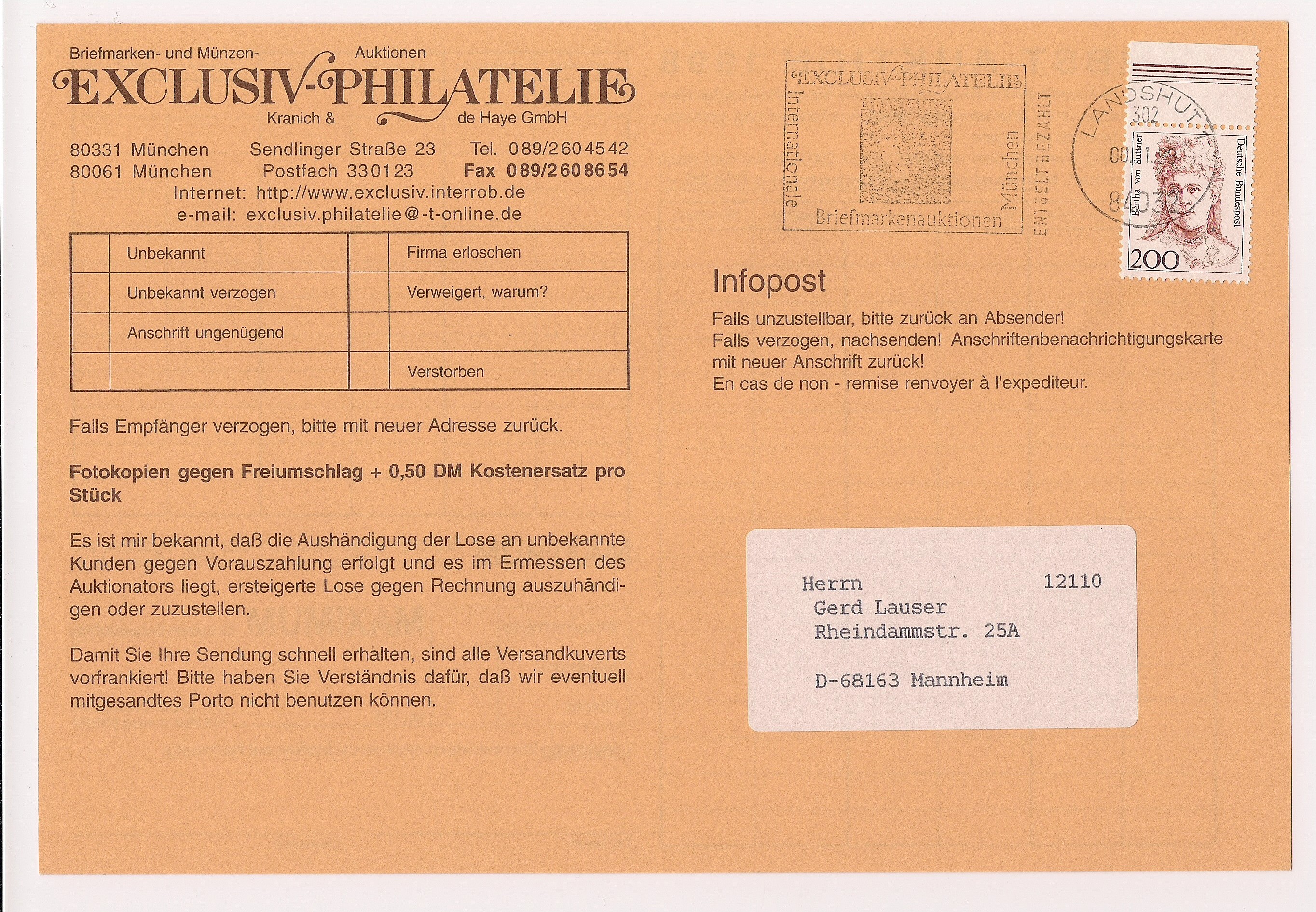 Eine kleine Ergänzung noch, nämlich die Absenderstempel zur Freimachung von Massendrucksachen (später Infopost). Diese Stempel findet man häufig auf den niedrigen und "krummen" Werten der Dauerserien. Die Stempel werden durch Absenderstempelmaschinen angebracht, dies ist seit 1979 zulässig. In der Regel ist die Stempelfarbe schwarz, mir liegen allerdings auch Stempel aus Bielefeld in blauer Farbe vor, diese reiche ich bei Gelegenheit nach. Im Anhang 2 Beispiele.