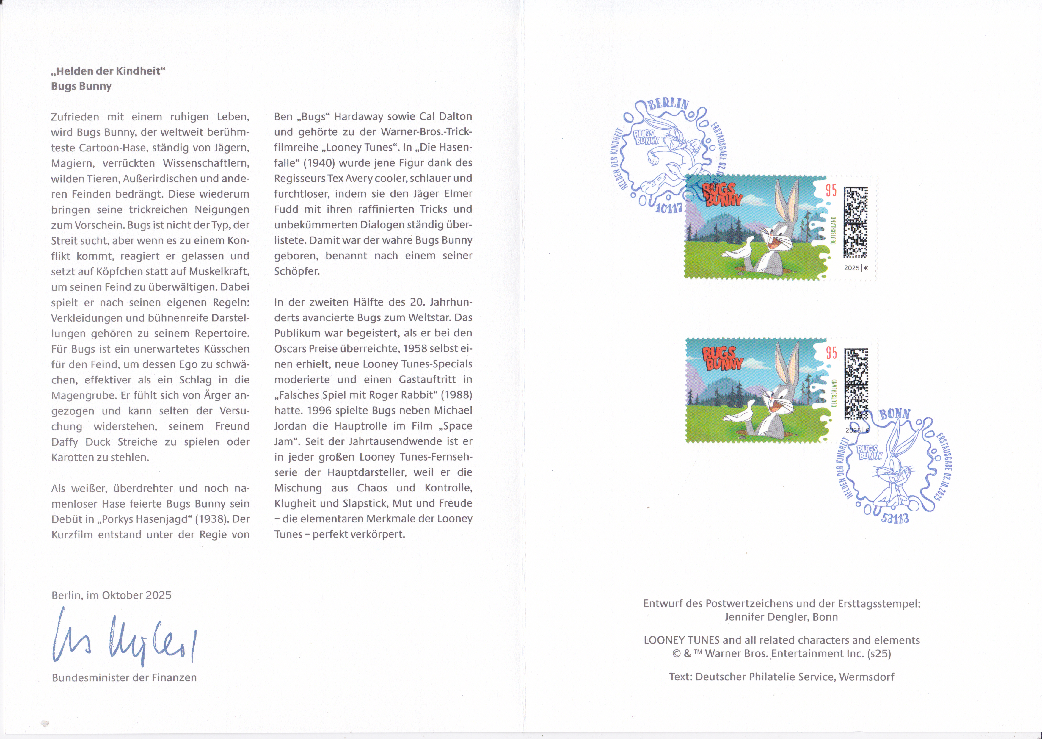 Ministerkarte des Bundesministers für Finanzen mit zwei Marken aus der Serie "Helden der Kindheit" mit dem Motiv "Bugs Bunny" (MiNr 3928) mit den beiden Ersttagsonderstempel Bonn und Berlin.