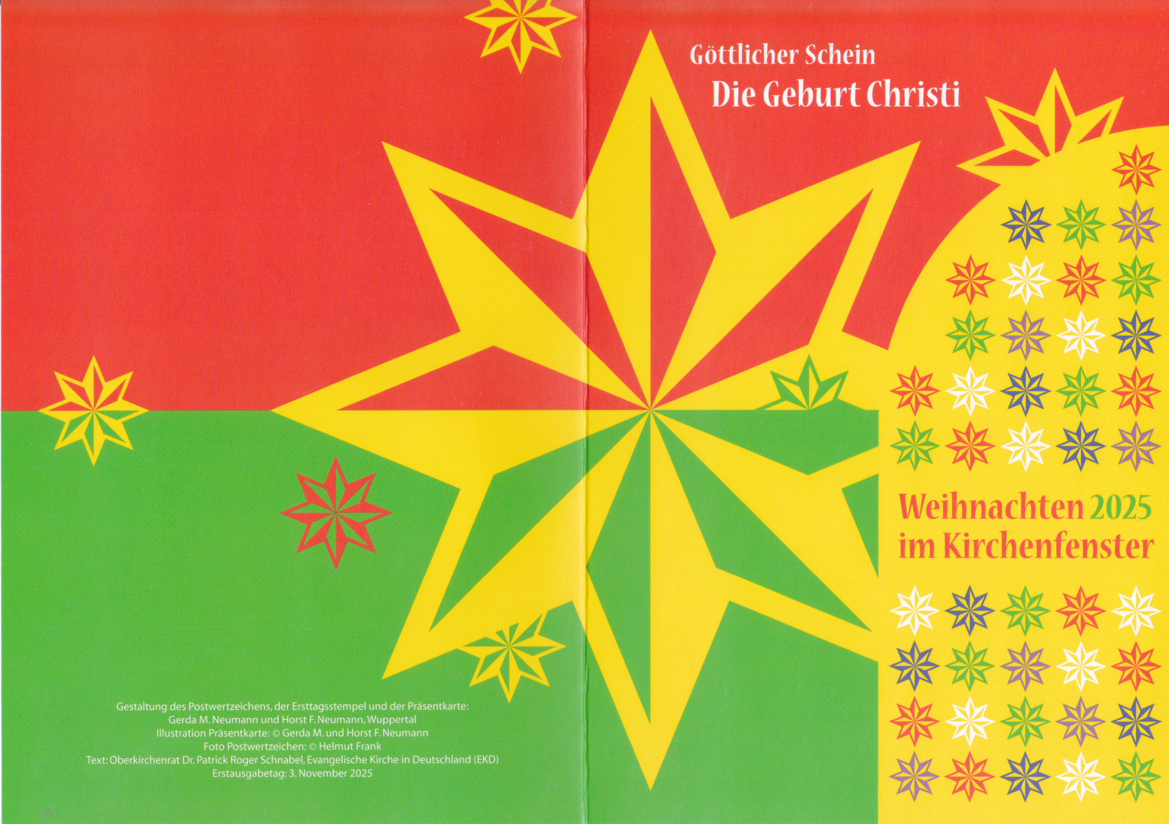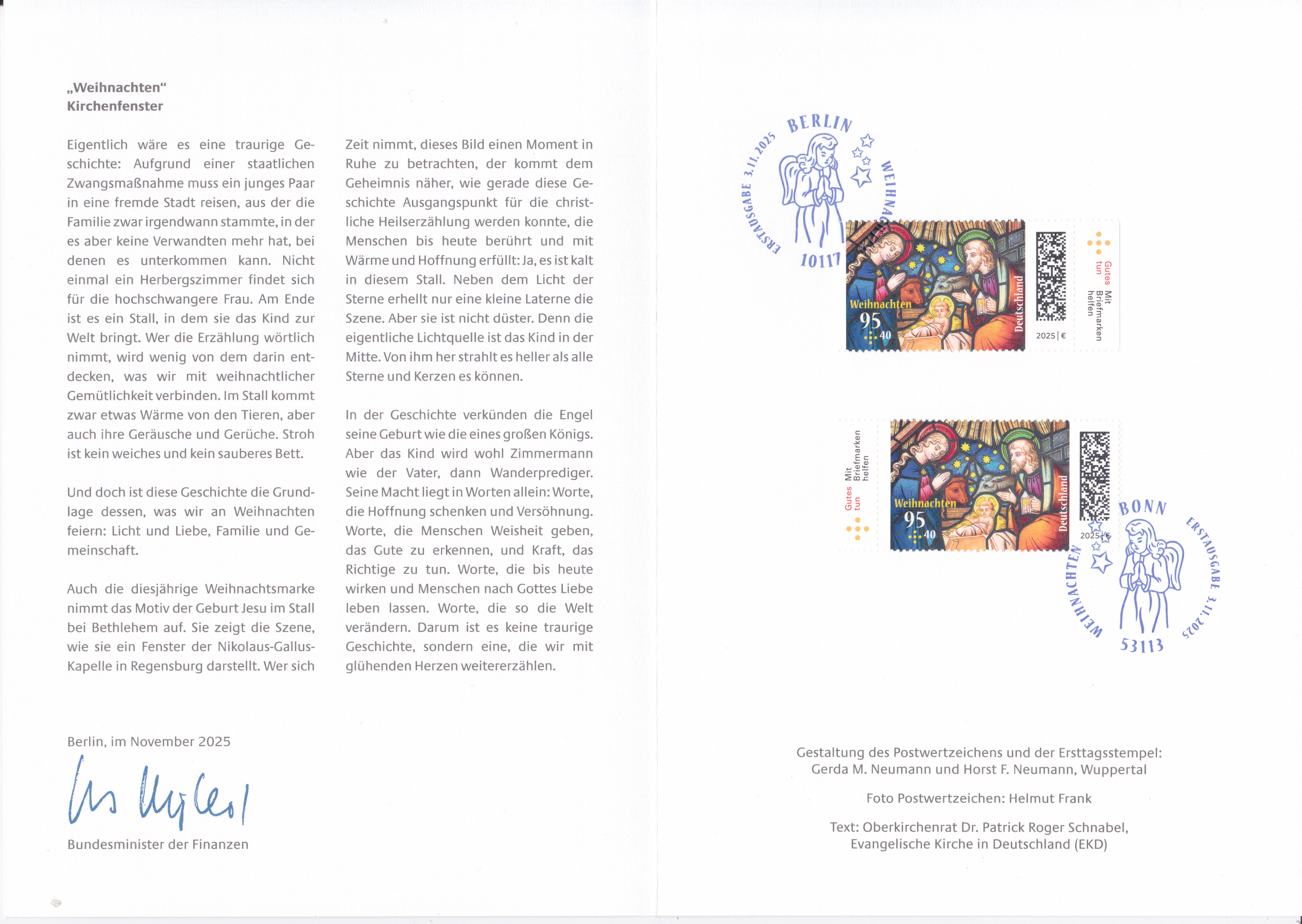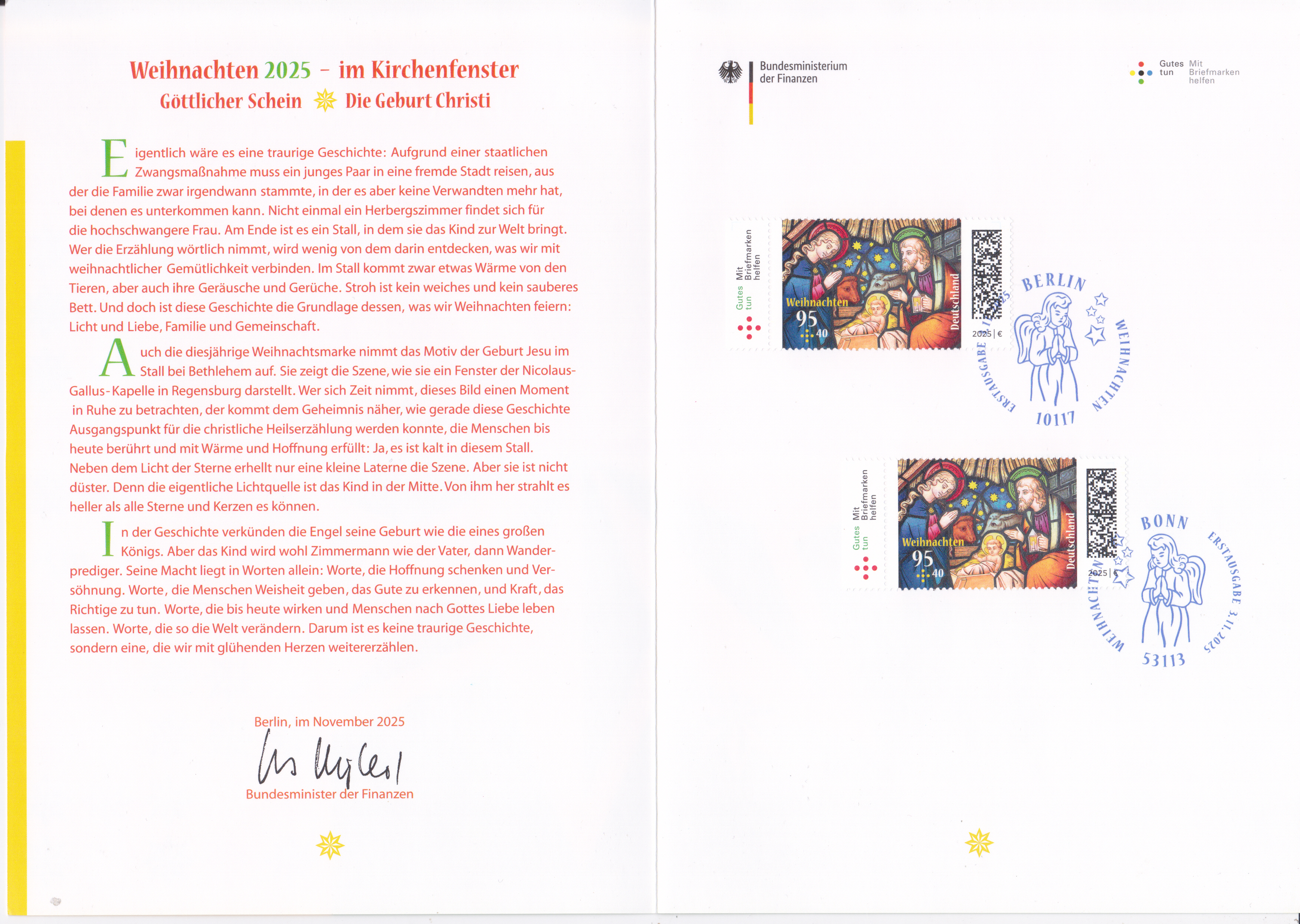 Ministerkarte des Bundesministers für Finanzen mit zwei Marken "Weihnachten" (MiNr 3932) mit dem Motiv "Christi Geburt" aus einem Kirchenfenster der Nikolaus-Gallus-Kapelle im Alumneum in Regensburg" mit den beiden Ersttagsonderstempel Bonn und Berlin.