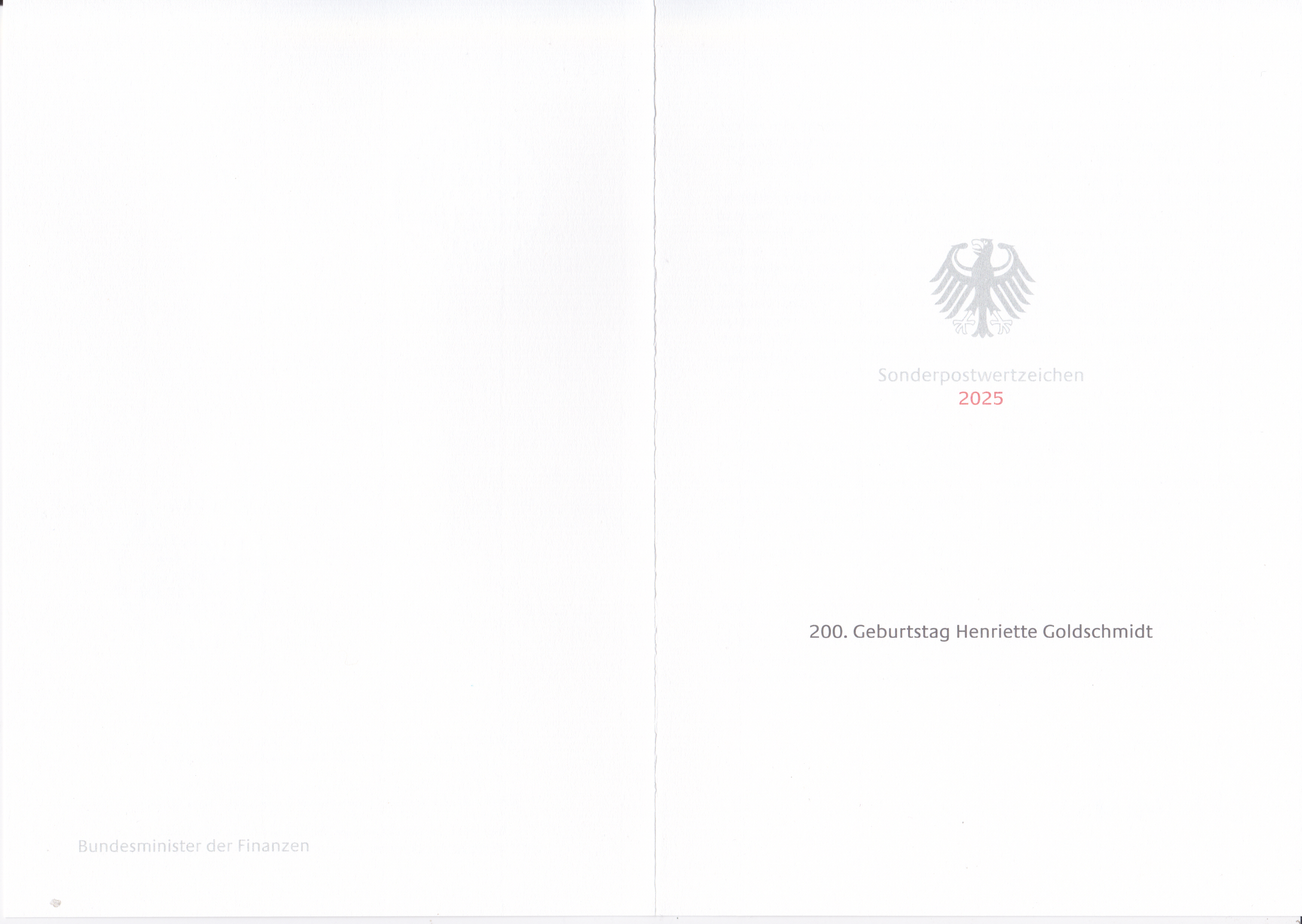 Ministerkarte des Bundesministers für Finanzen mit zwei Marken zum 200. Geburtstag von Henriette Goldschmidt (MiNr 3934) mit den beiden Ersttagsonderstempel Bonn und Berlin.