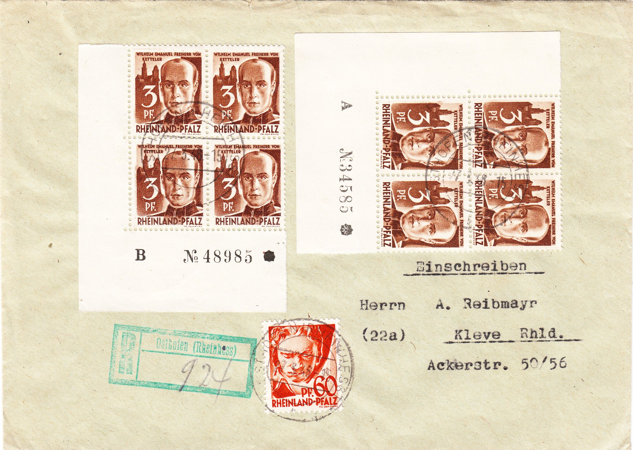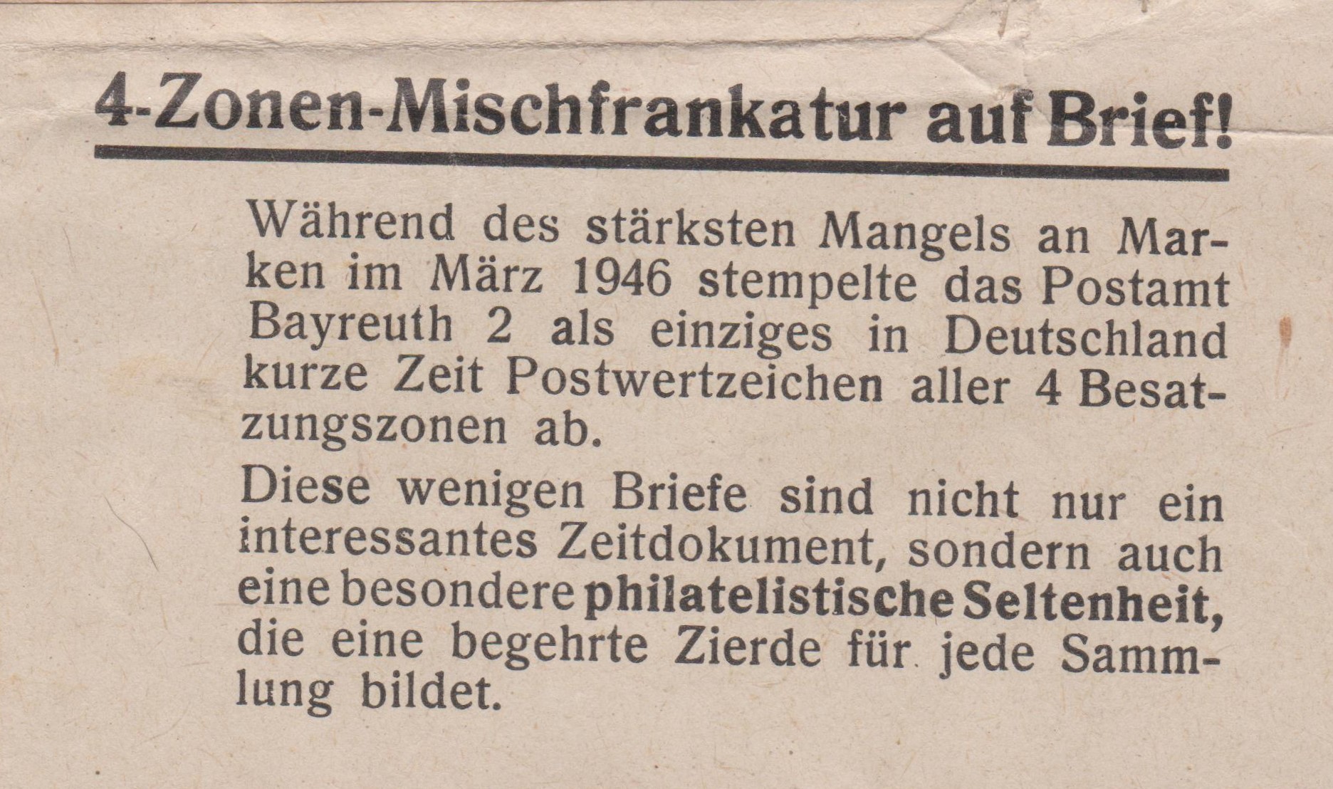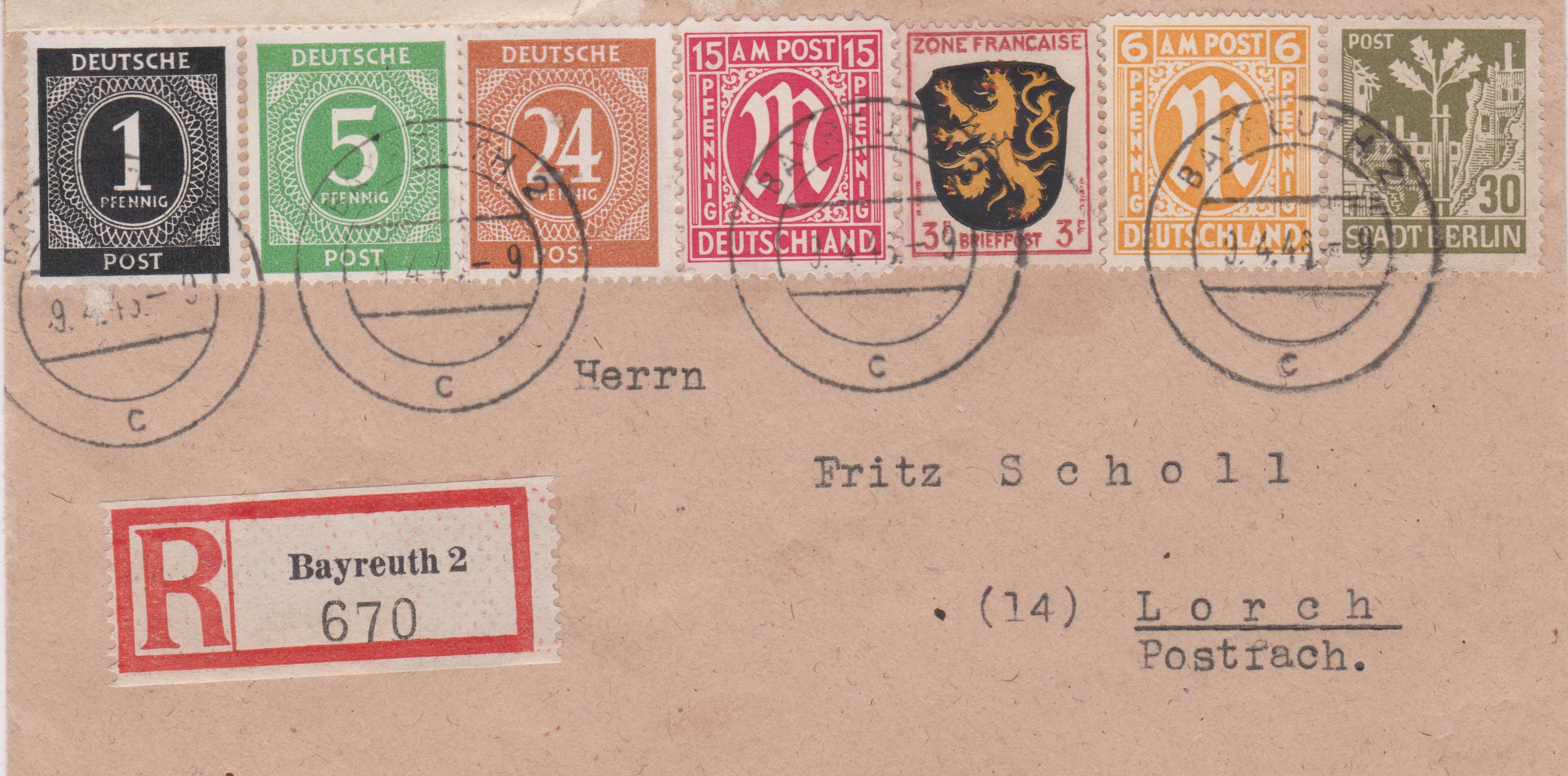 Hier eine interessante Mischfrankatur von Briefmarken der Kontrollrat-Ziffernserie, AM POST, Französischer Zone sowie Alliierter Besetzung (Berlin) am 09.04.1946 auf Fernbrief per Einschreiben von Bayreuth 2 nach Lorch: